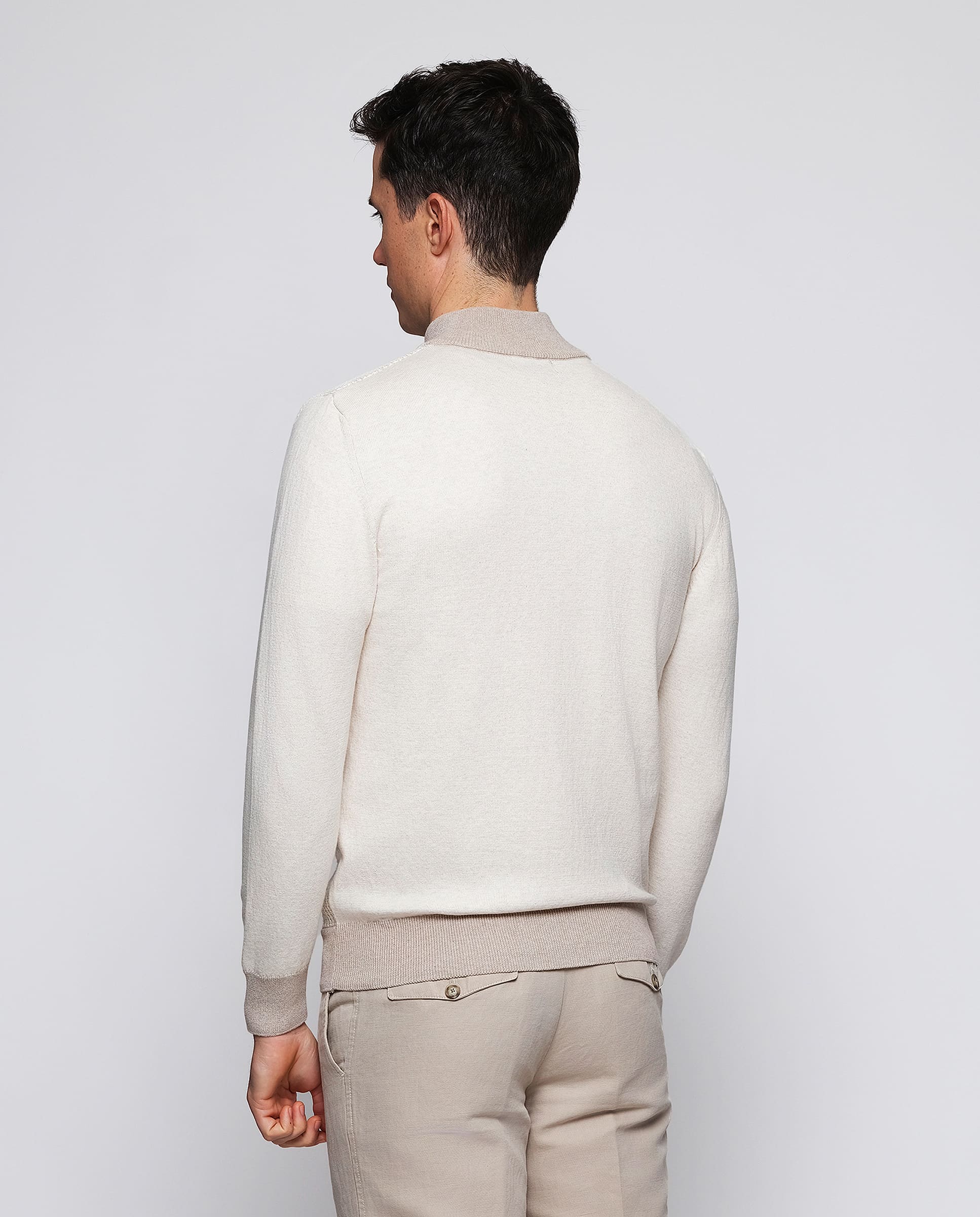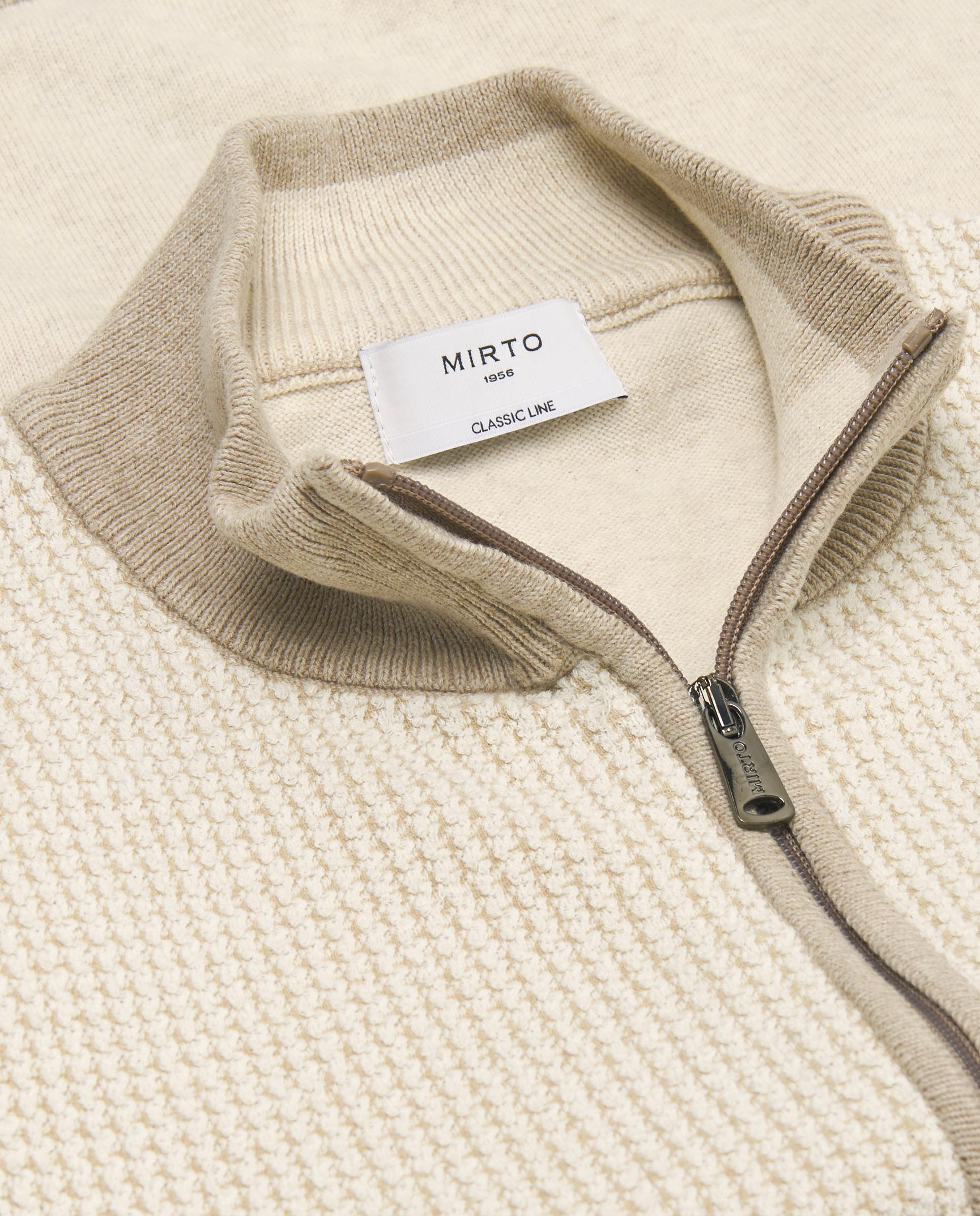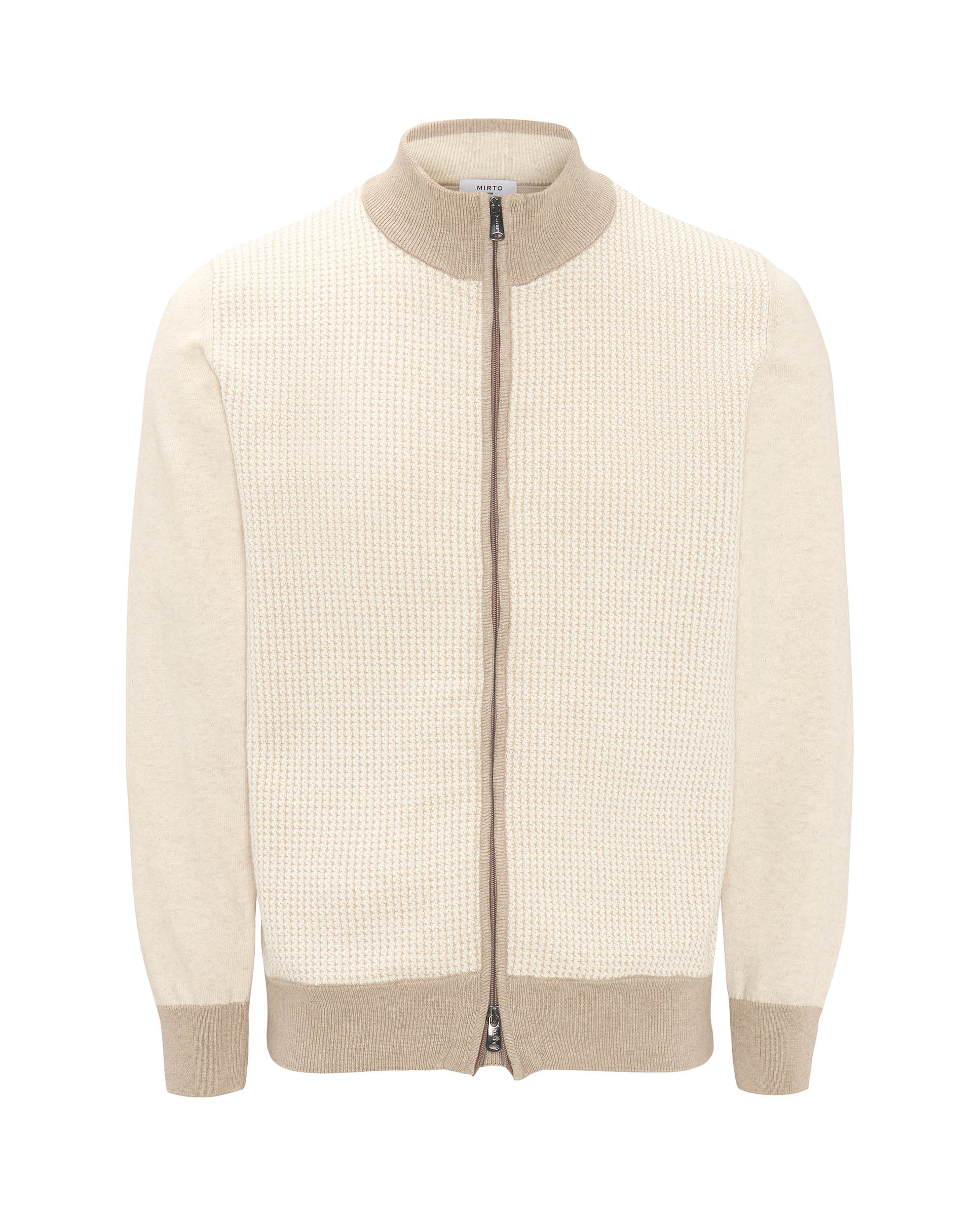 100% cotton knit cardigan with jacquard front. Perkins collar, double ride zip closure. Contrast details, ribbed finishes.