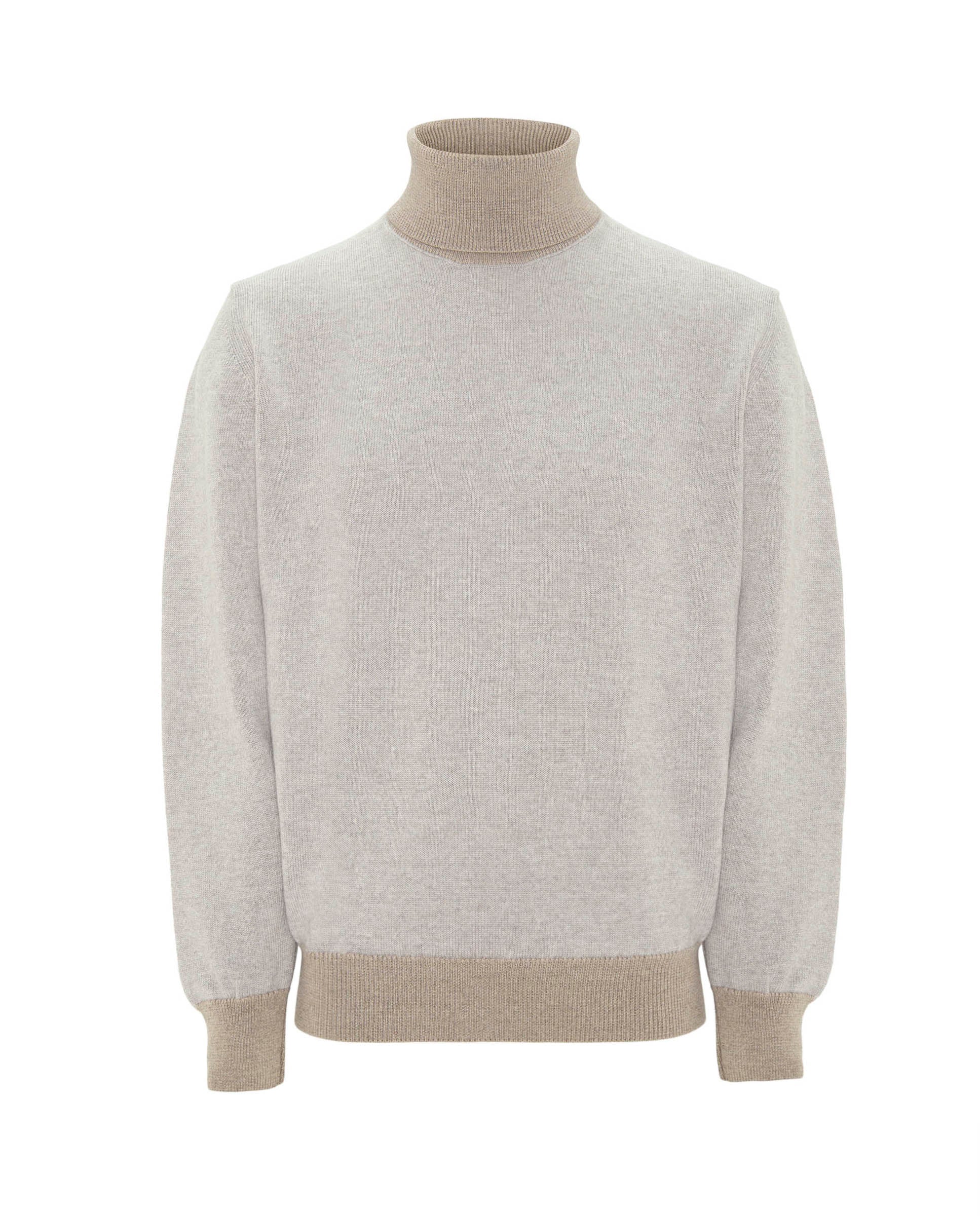 100% wool turtleneck sweater. Contrasting ribbed collar, cuffs, and hem. A very essential garment with an elegant hue for elevated styles or with an over-shirt for casual options.