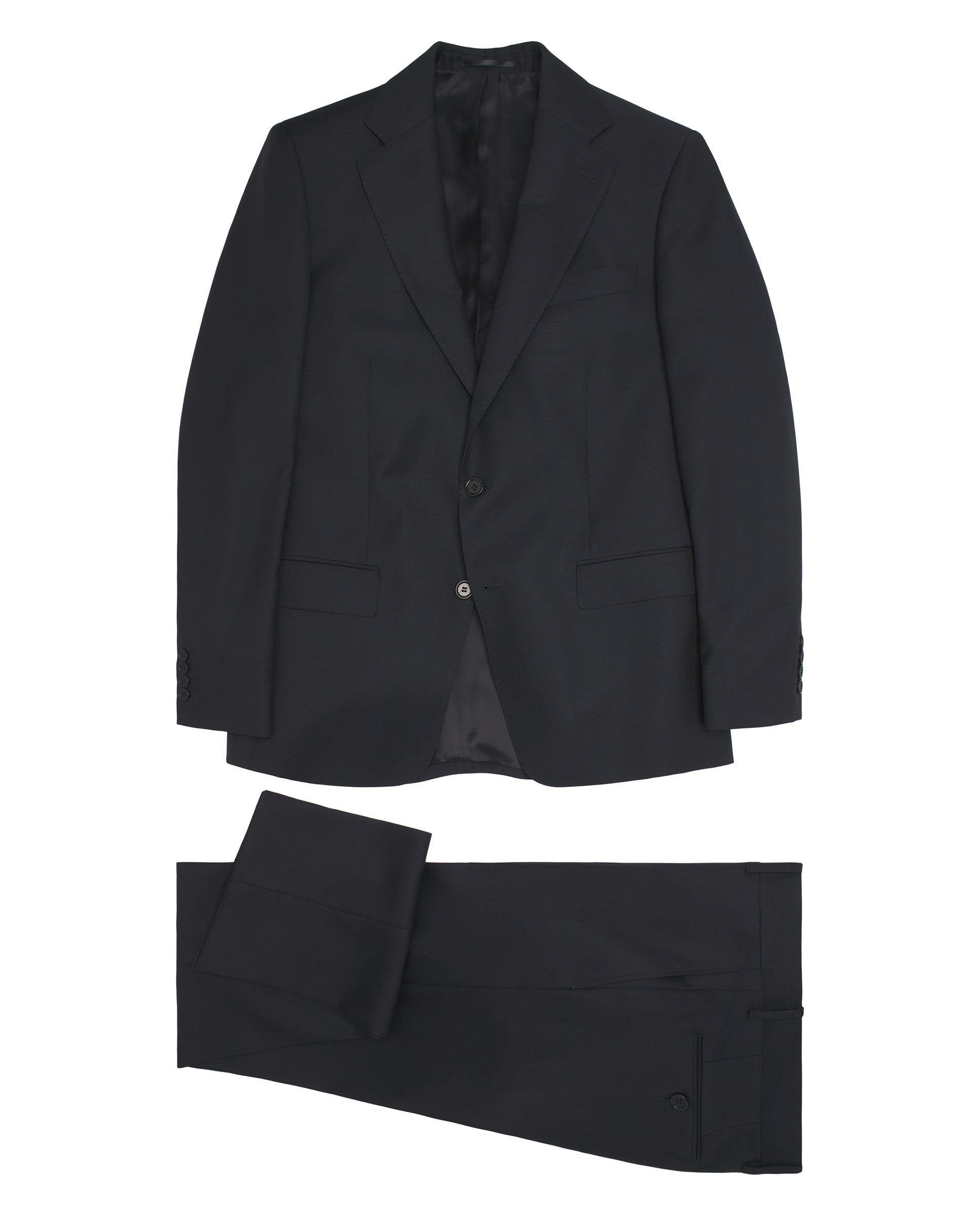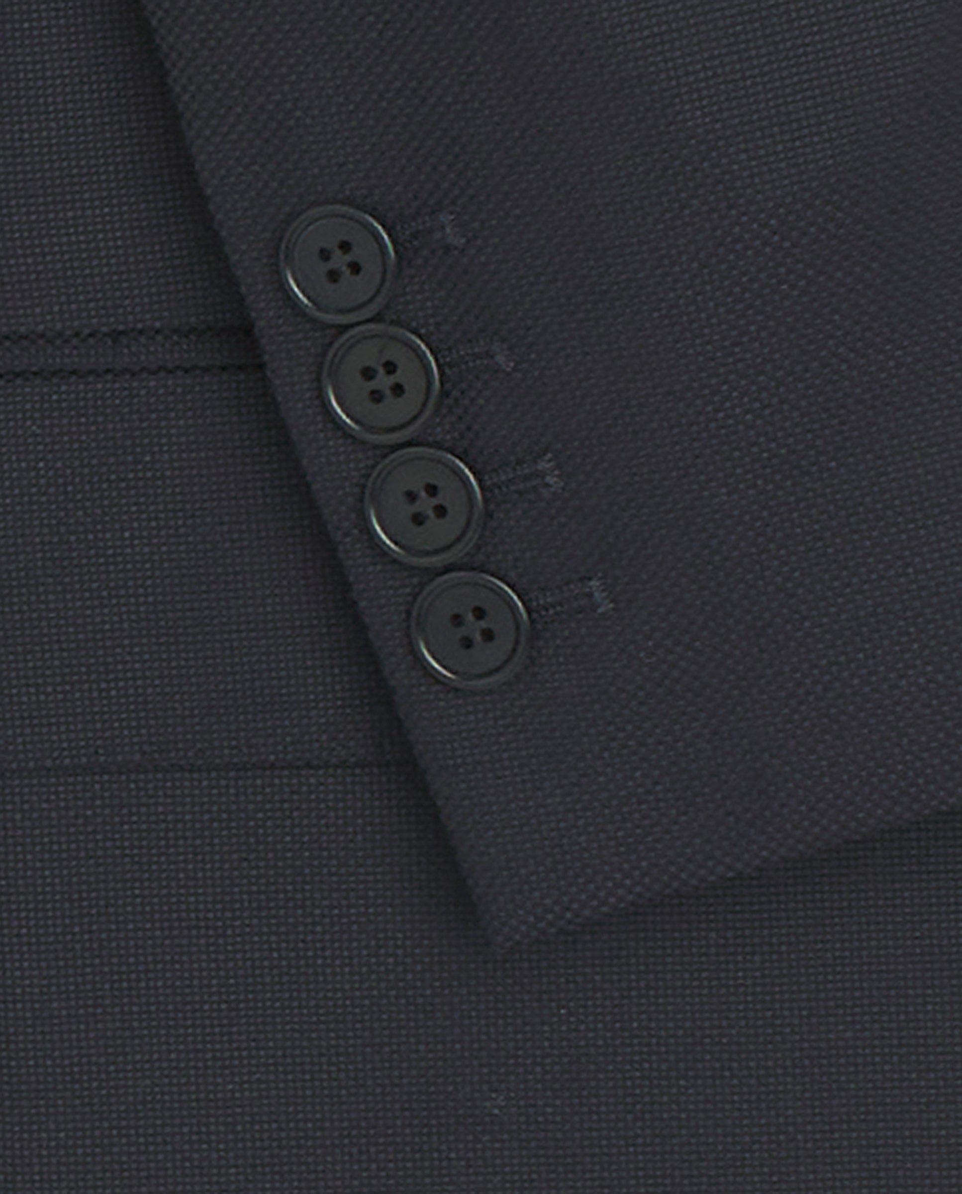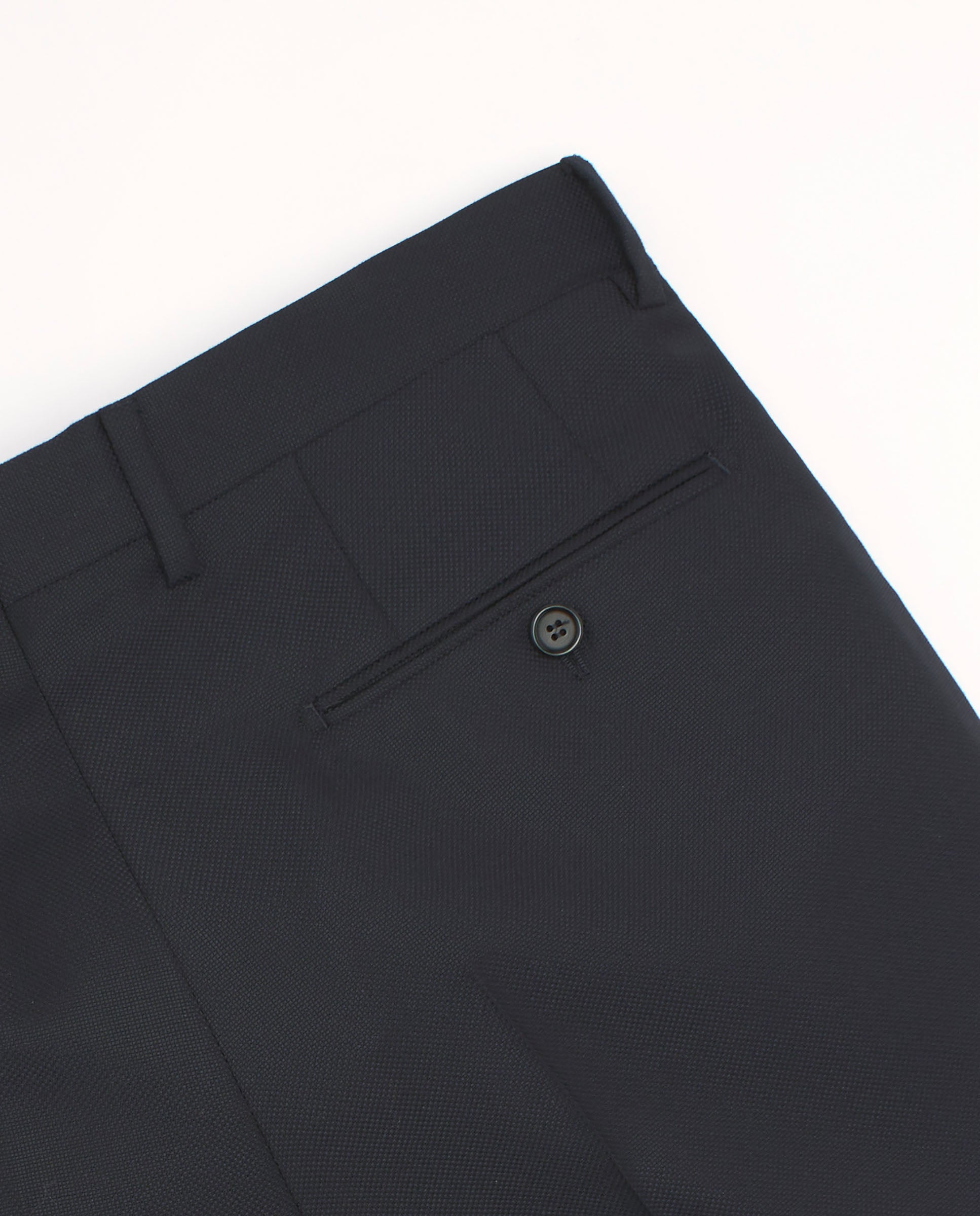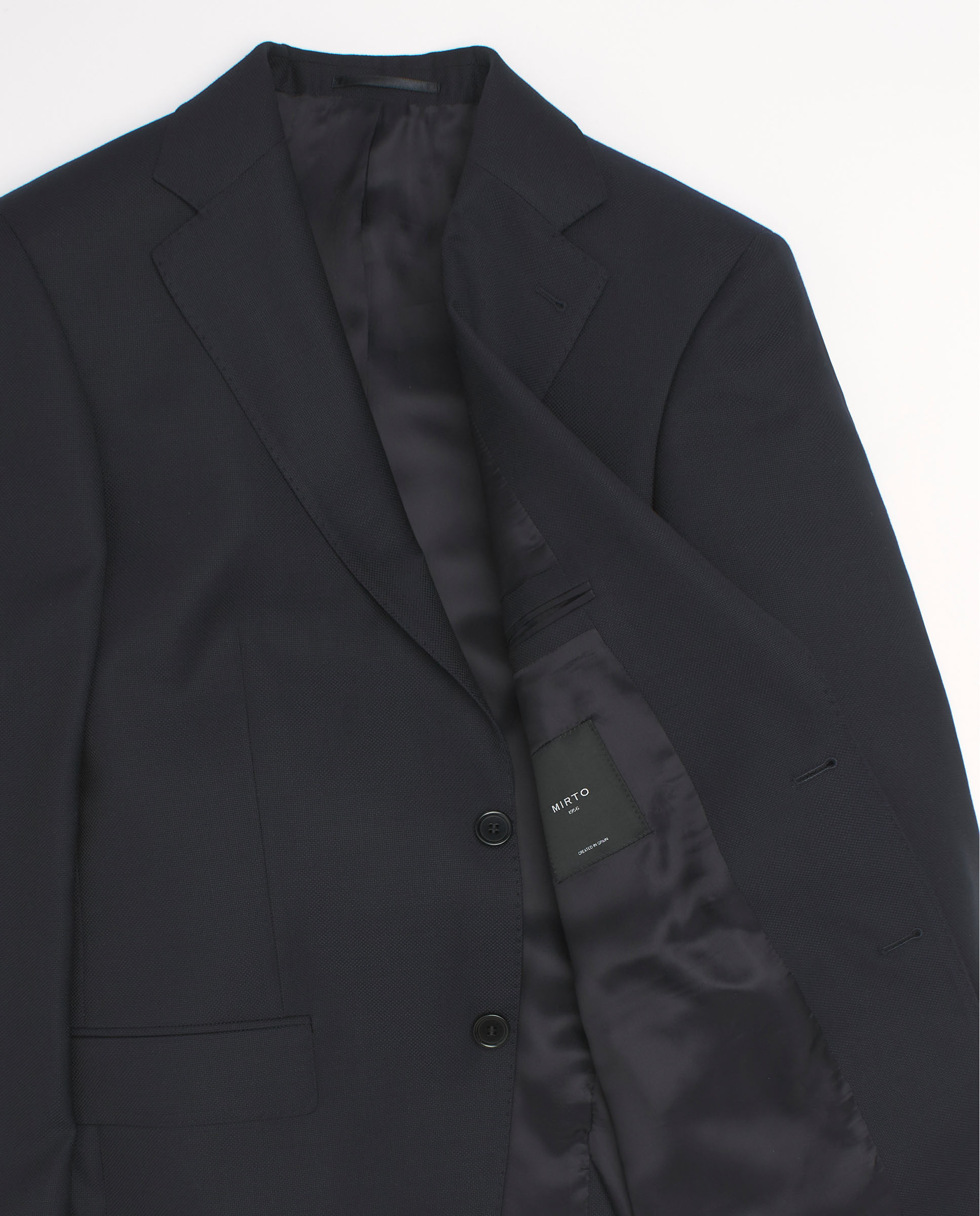Navy blue 100% wool birds-eye structure suit, regular fit. Jacket fully lined, shoulder pads, classic lapels, single-breasted two-button closure, straight flap pocket, side vents. Trousers without darts & slant pockets. Sartorial, timeless, evolved style.