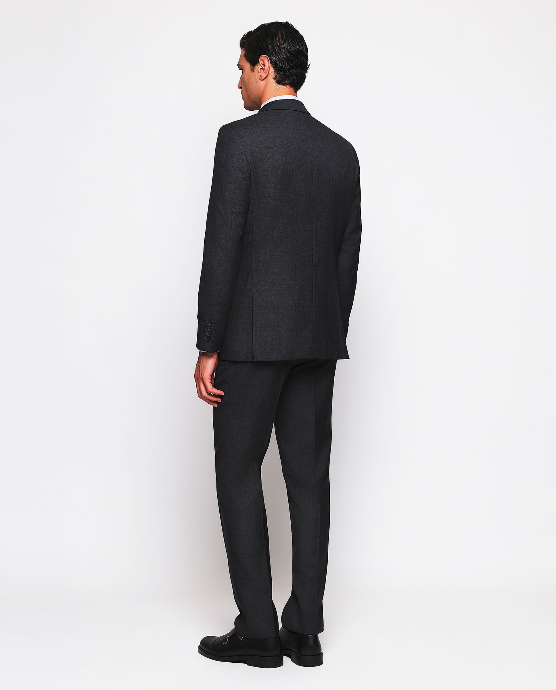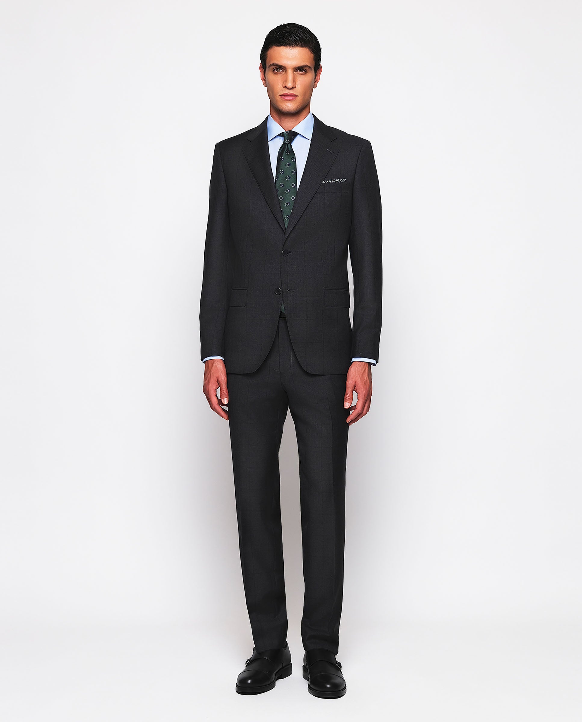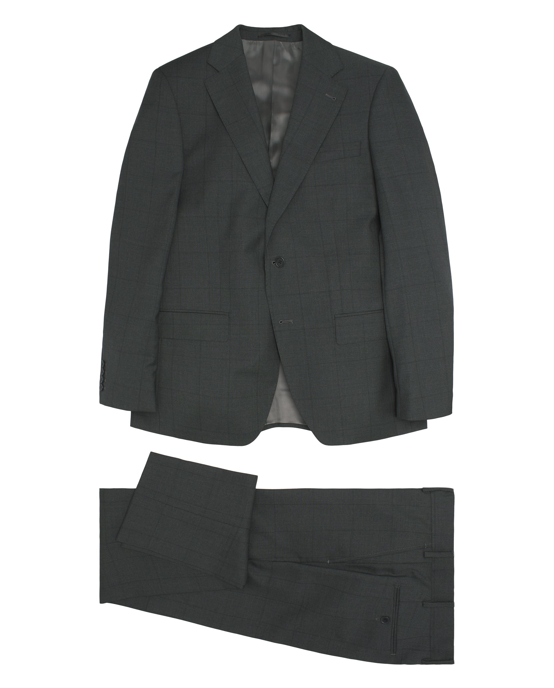 Medium gray 100% wool windowpane suit, regular fit. Jacket fully lined, shoulder pads, classic lapels, single-breasted two-button closure, straight flap pocket, side vents. Trousers without darts & slant pockets. A classic grid, a balanced, timeless style.