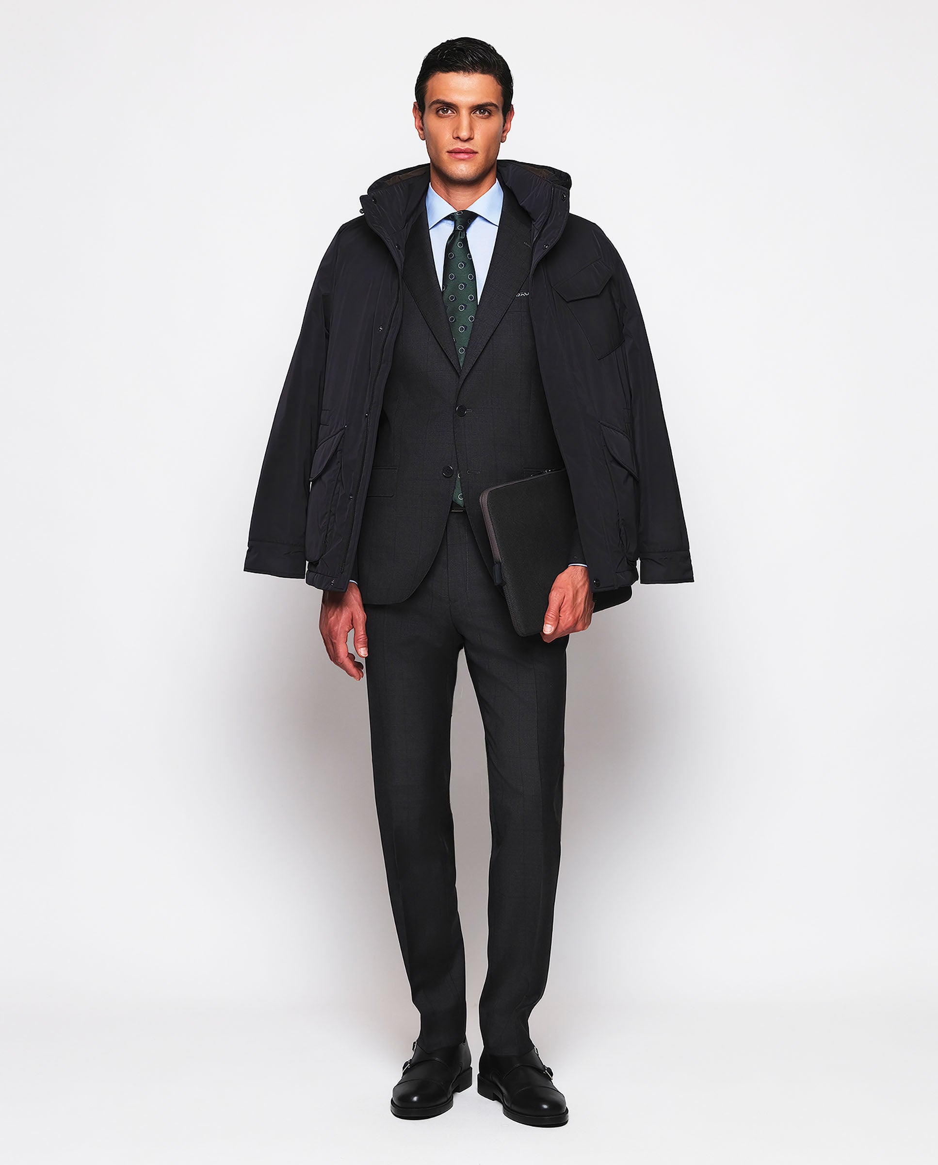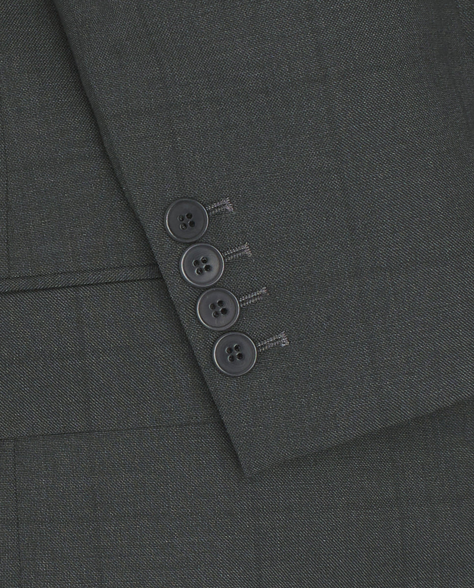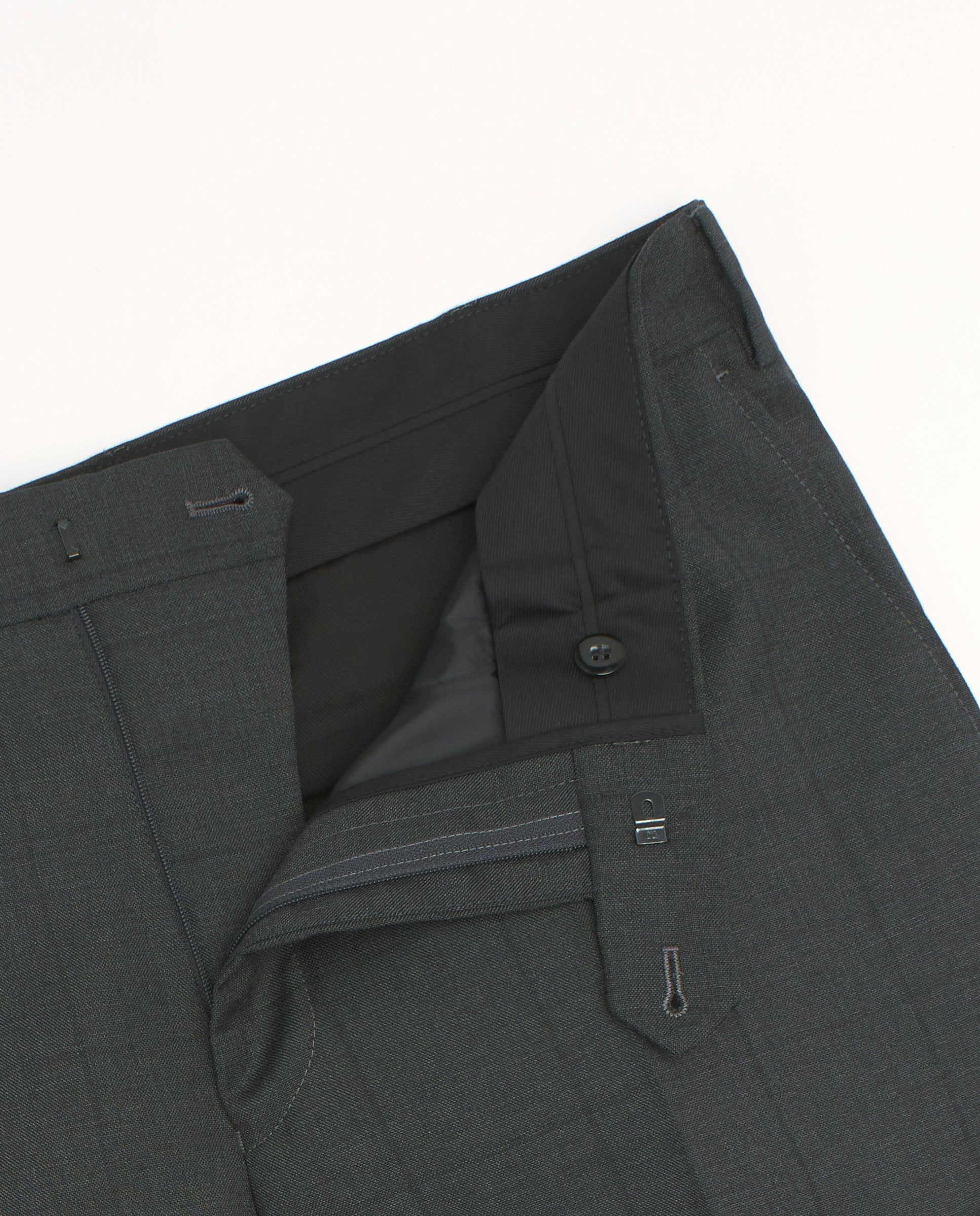Medium gray 100% wool windowpane suit, regular fit. Jacket fully lined, shoulder pads, classic lapels, single-breasted two-button closure, straight flap pocket, side vents. Trousers without darts & slant pockets. A classic grid, a balanced, timeless style.