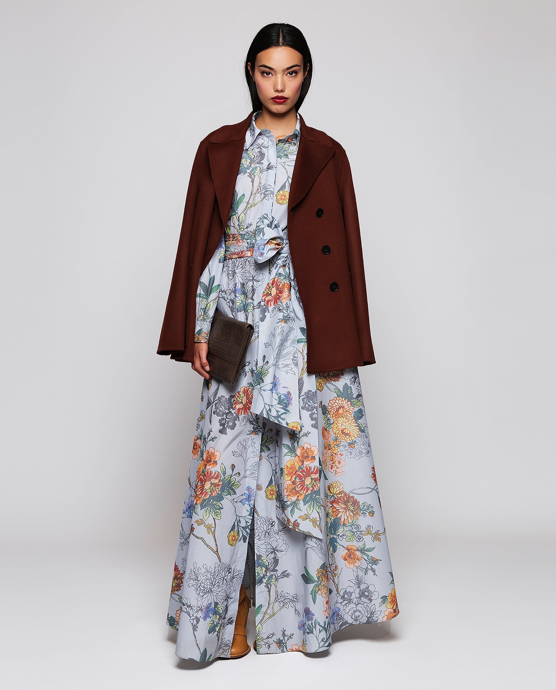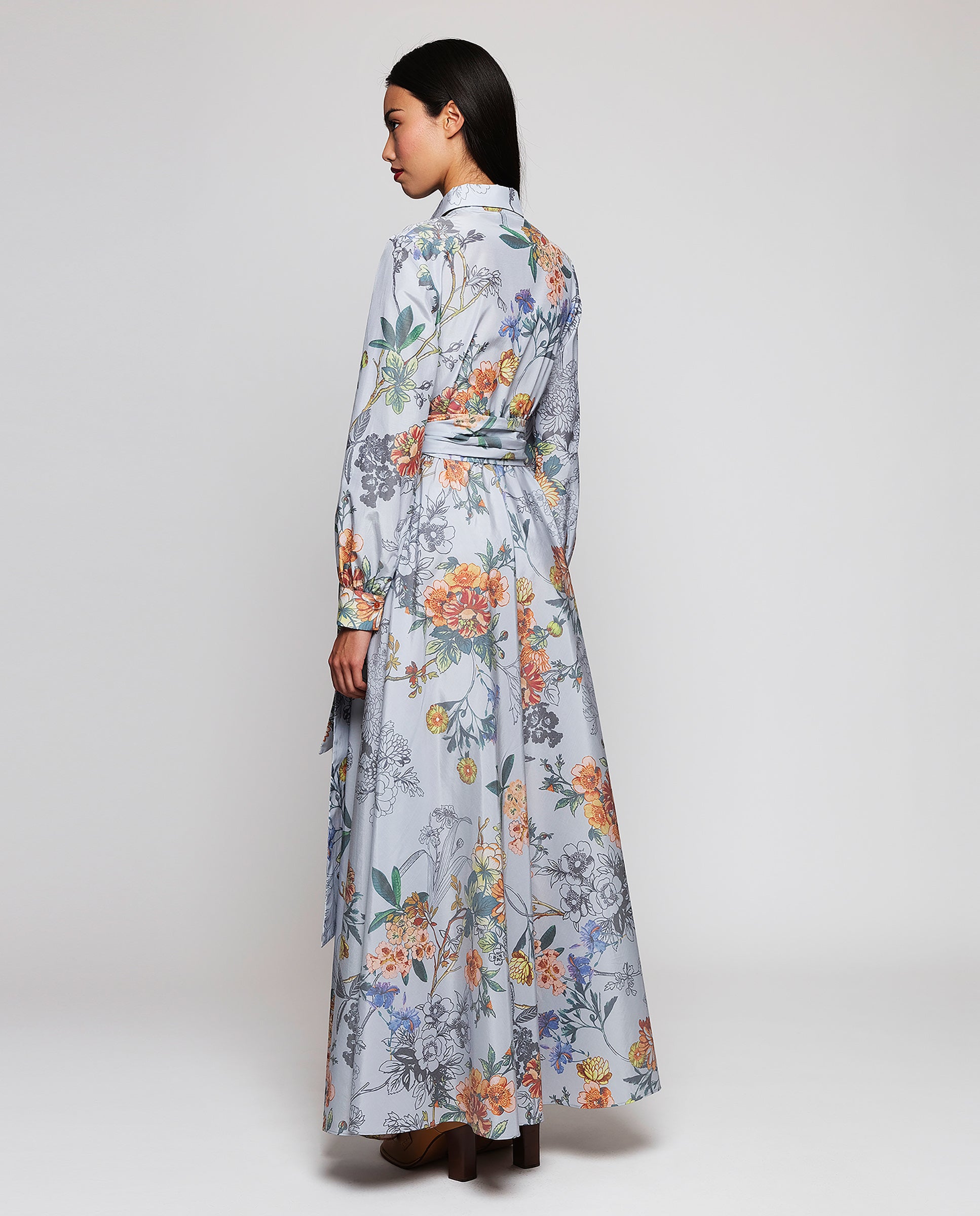 Long floral print shirt dress in taffeta. Collar, hidden button fastening, long slightly puff sleeves with cuffs & side pockets. Belt in same fabric. Harmonious elegance, subtle details, versatile stand out styles.