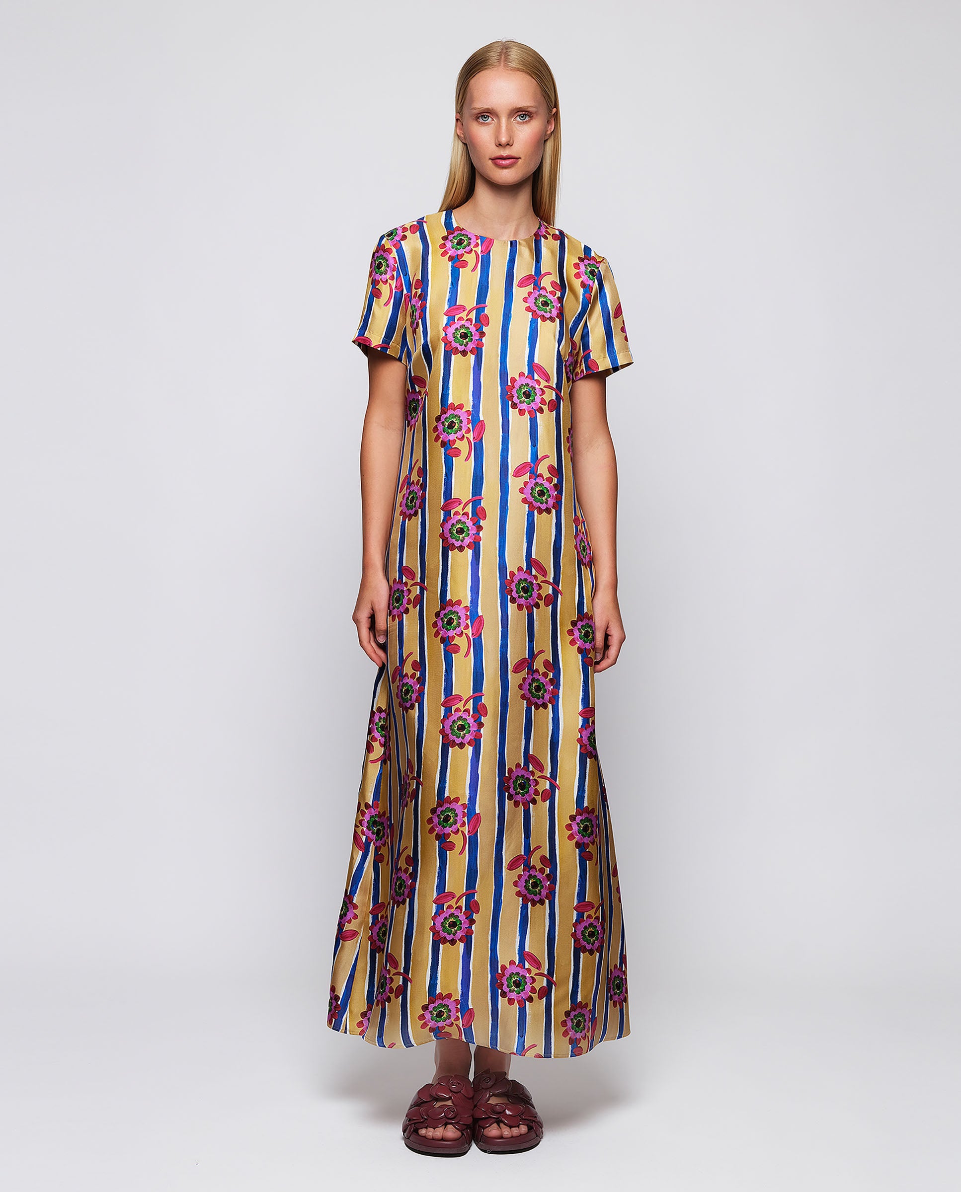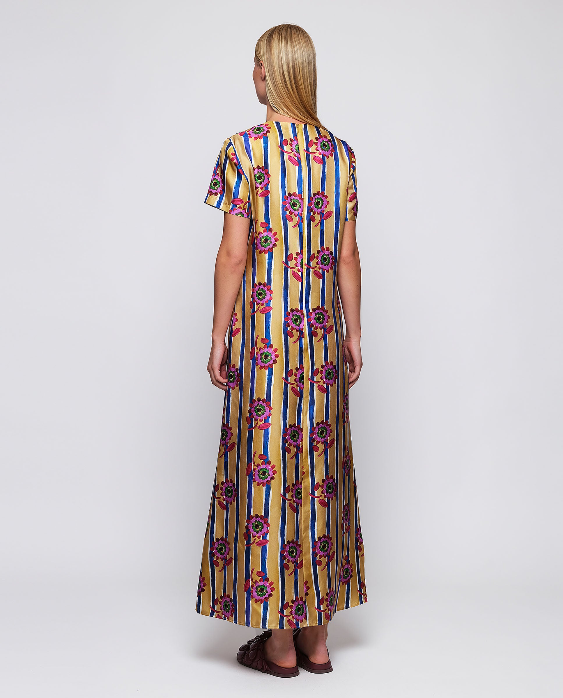 100% Liberty silk twill floral striped long column dress with mild evasé cut. Round neckline, short sleeves, invisible back zip closure. Fluid fit.