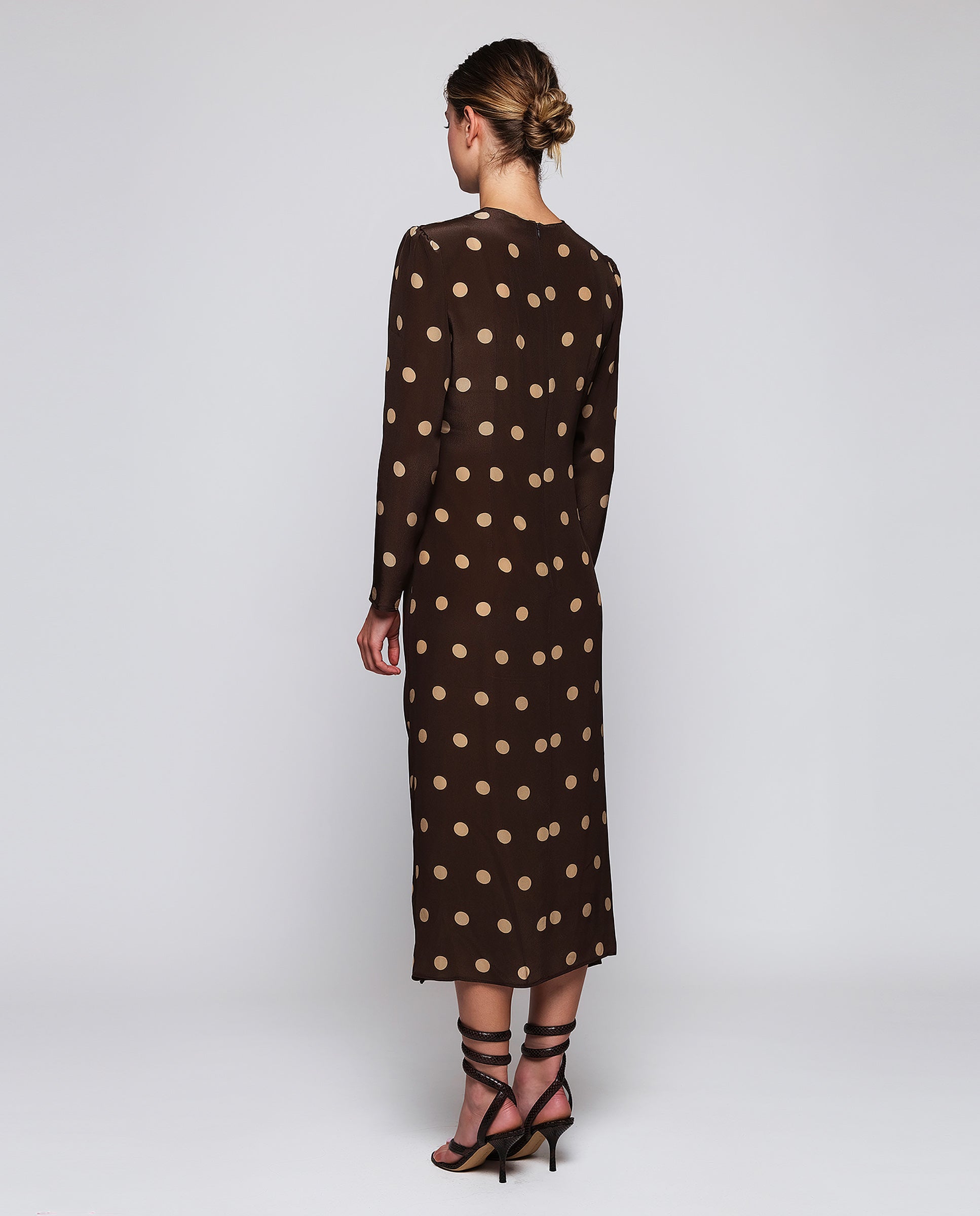 Midi dress, dot print. Square neckline, draped at waist, invisible back zip fastening, long sleeves. Includes slip dress.