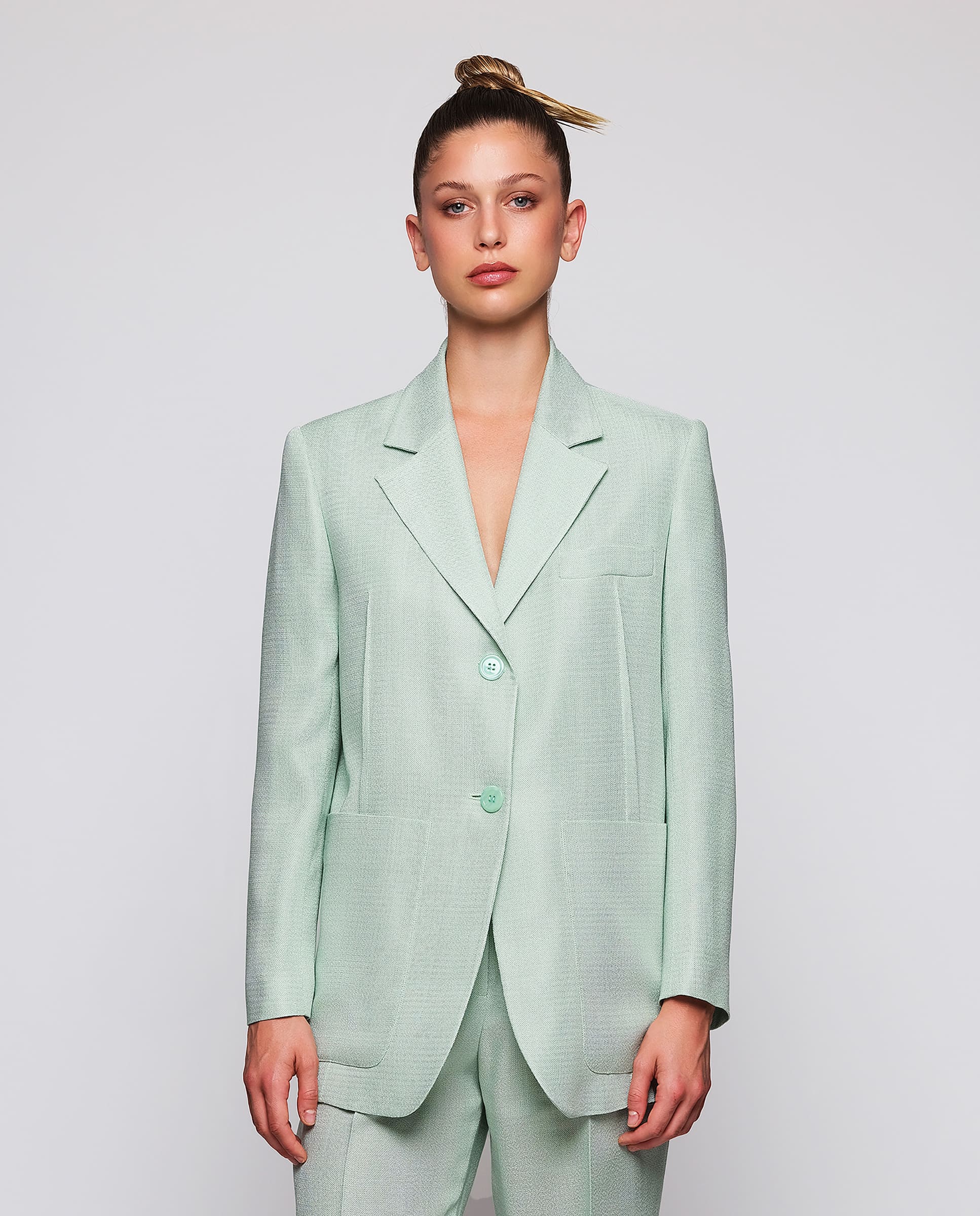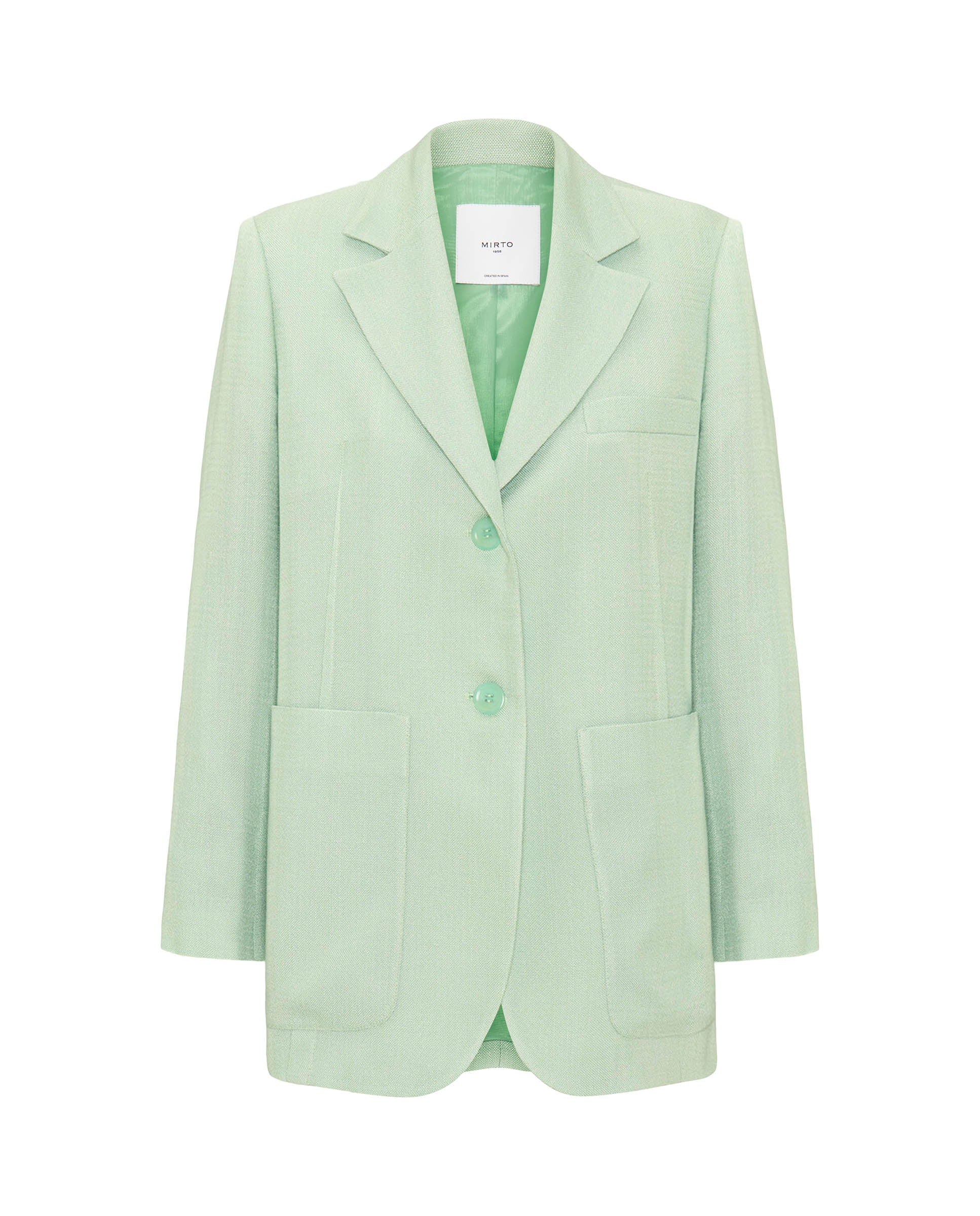 Green suit blazer. Collar, lapels, two button central closure. Breast pocket, two front maxi pockets & detail of visible darts. Oversized fit. Lined.