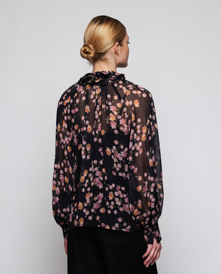 Mauve jacquard blouse with a floral print. High neck with a bow, button and invisible zipper closure at the back, long sleeves with cuffs. Straight fit. Contemporary romantic refinement. A blouse for daytime or evening looks.
