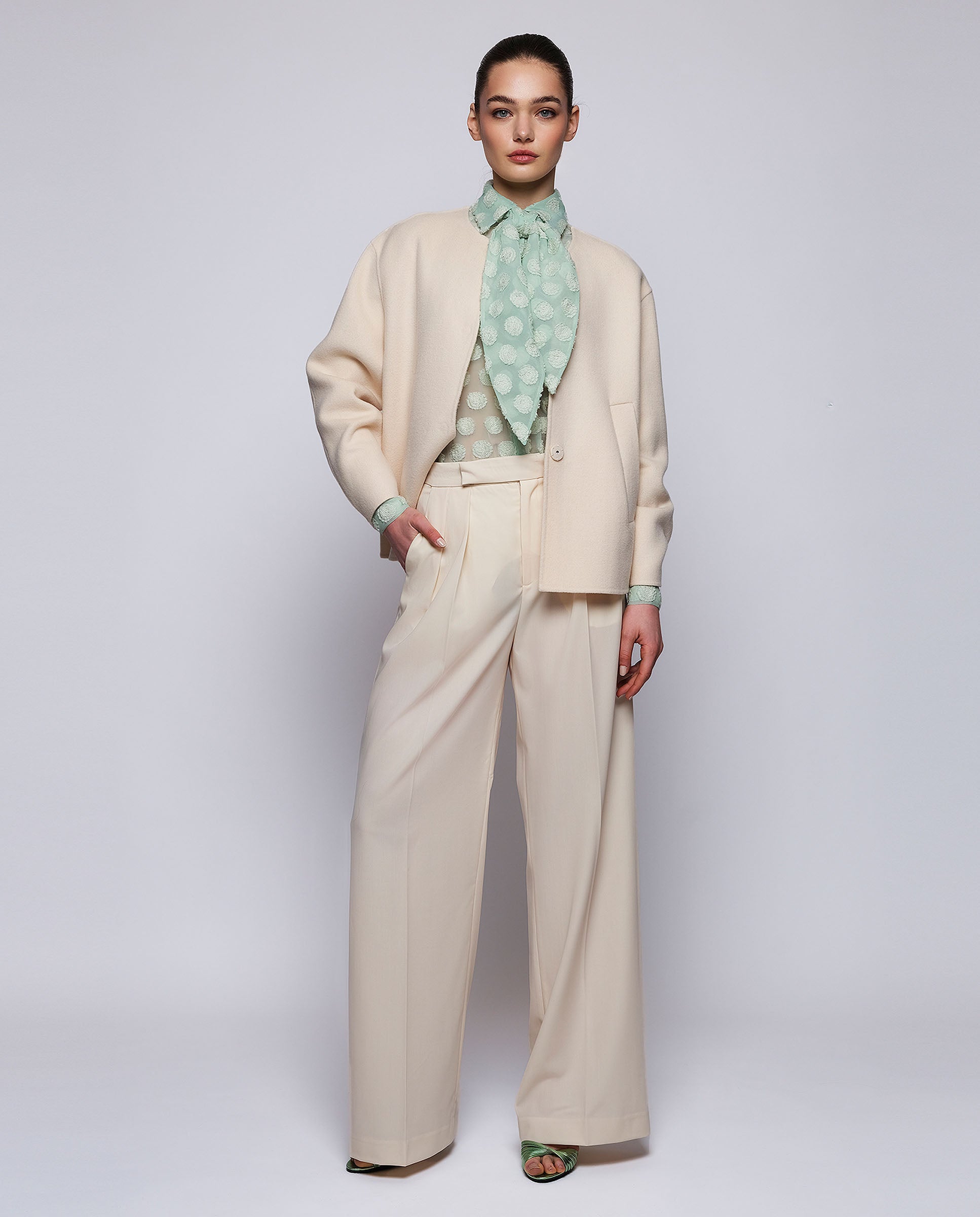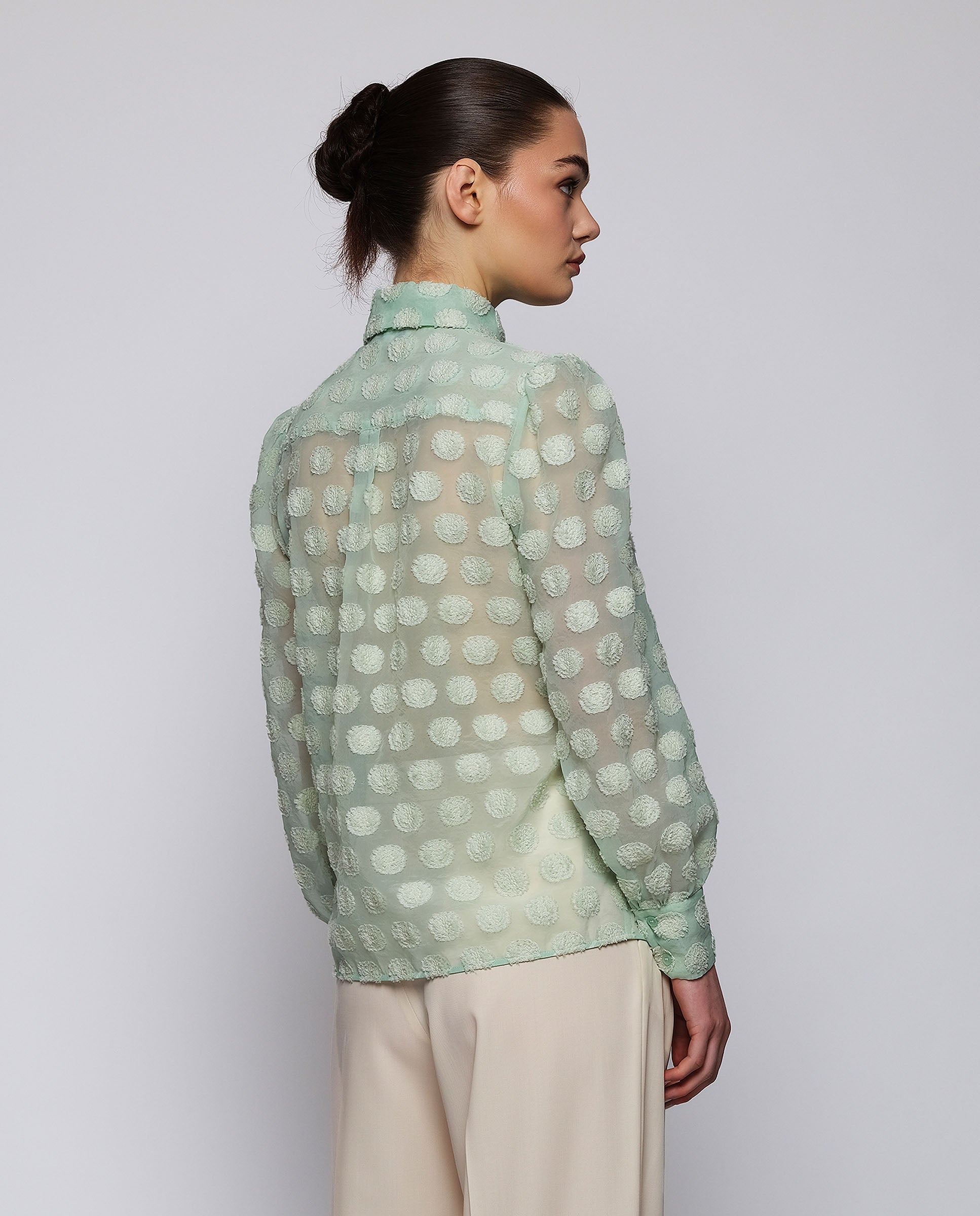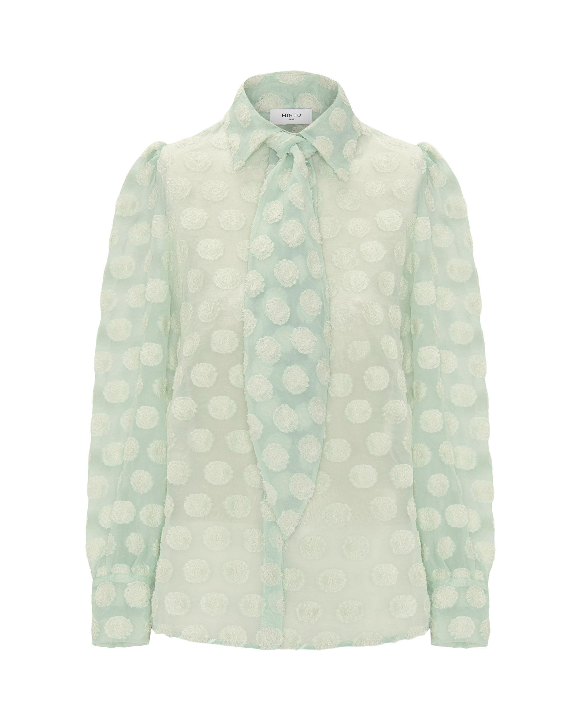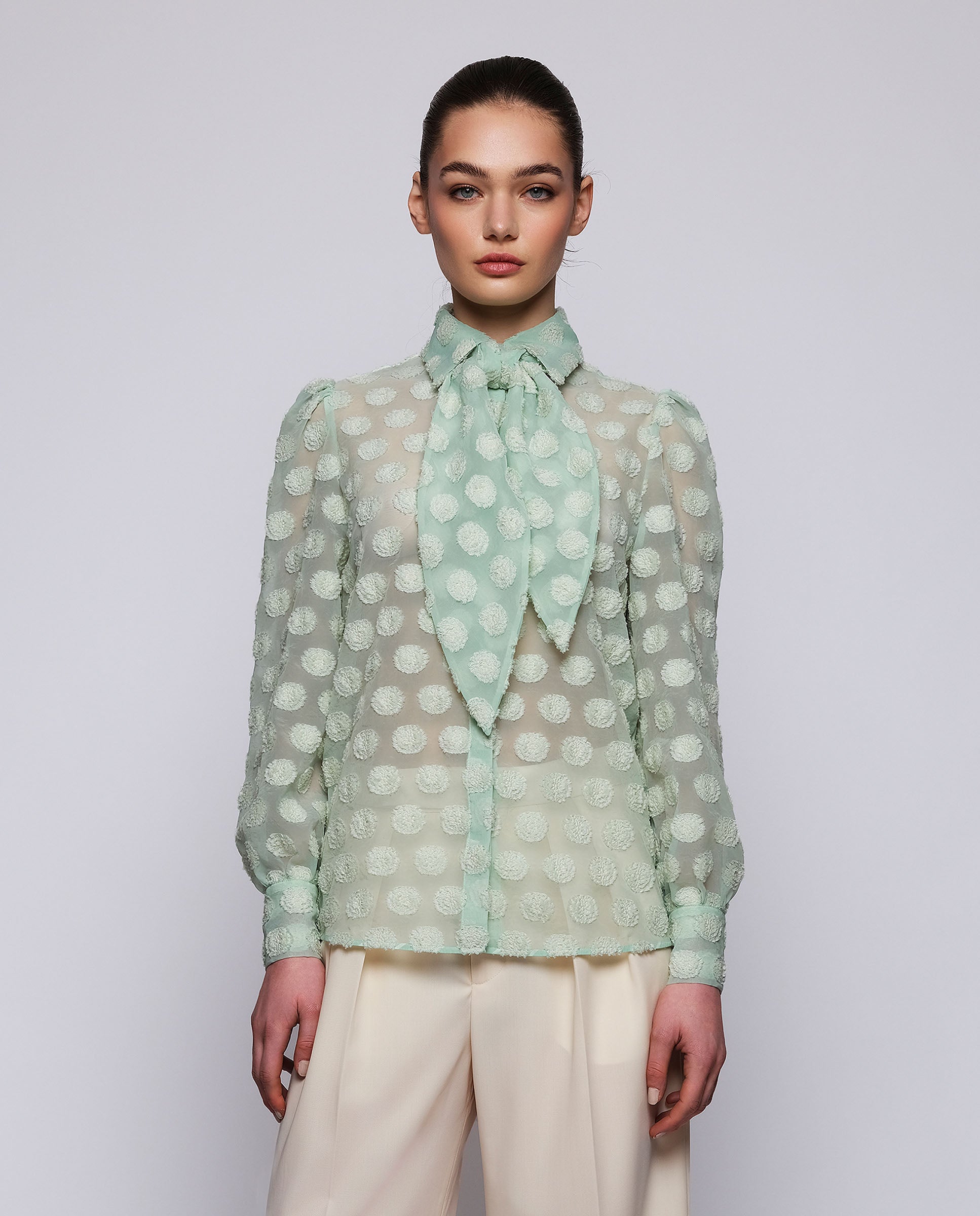 Green floral fil coupé organza shirt with bow. Collar, hidden button fastening, slightly puffed long sleeves with cuffs. Removable bow detail. Semi-fitted.