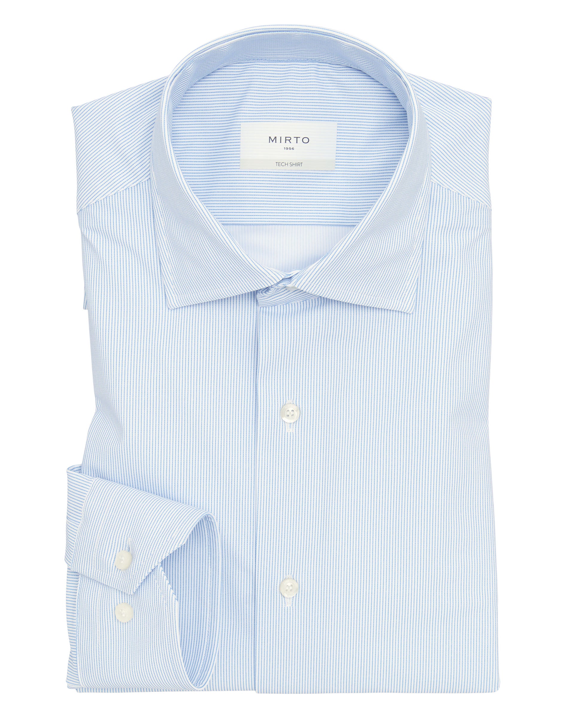 Long-sleeved technical dress shirt, no pocket, Italian collar with removable stays, tailored fit. High-performance fabric, comfortable and functional with a classic look, lightweight yet durable, natural feel that fits the body perfectly.