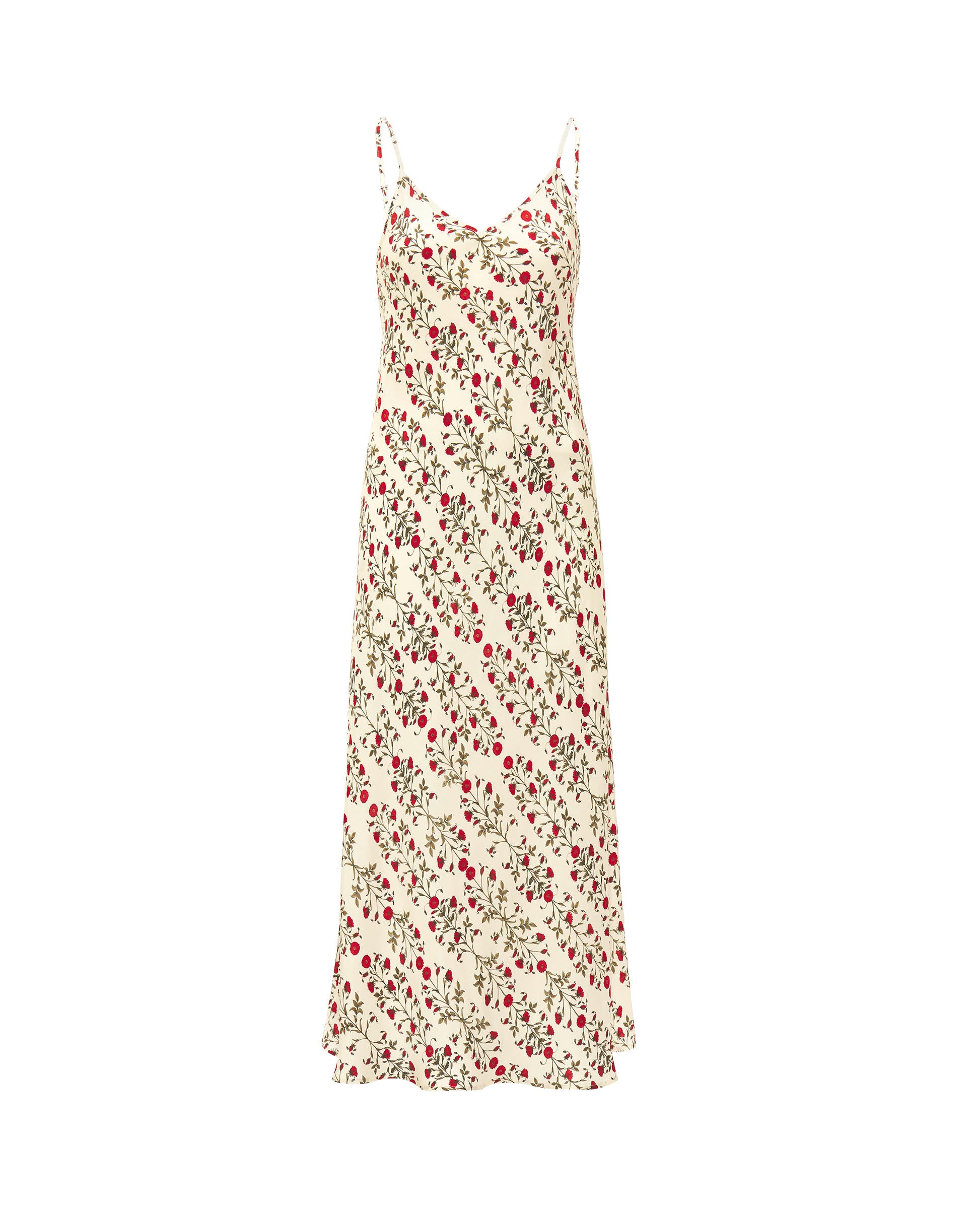 Bias-cut beige midi slip dress with red floral print . V-neckline & adjustable fine straps. An iconic piece for enjoying your glamorous style at home or on the red carpet of your life. Versatile chic, timeless elegance.