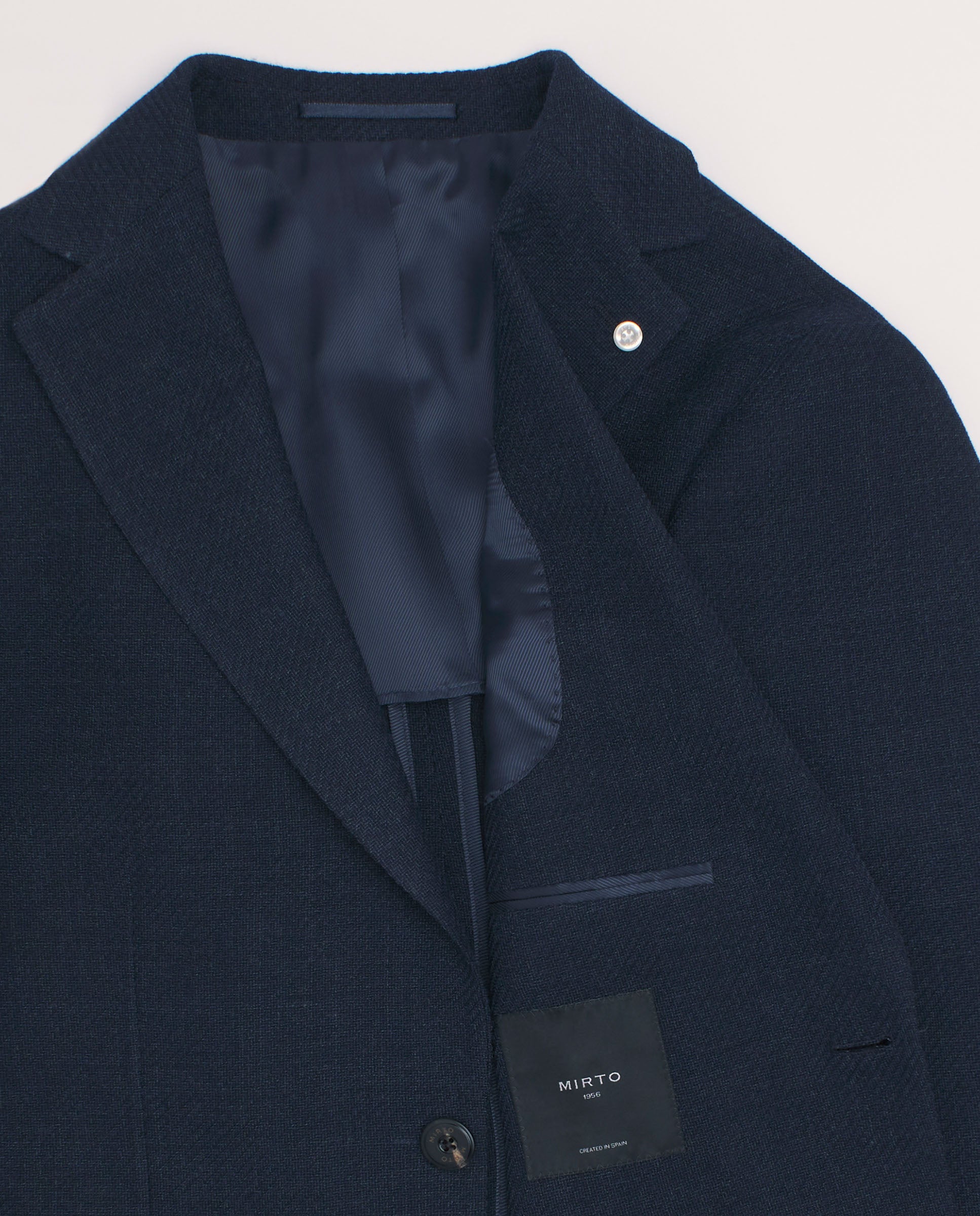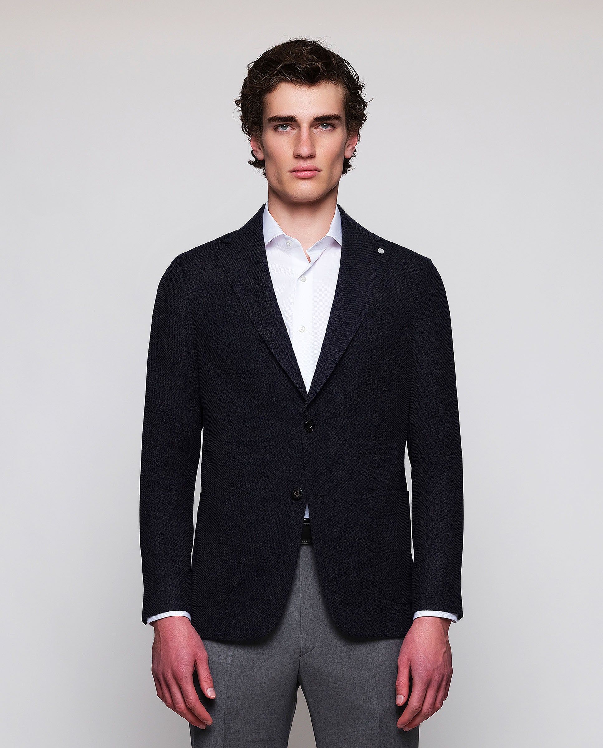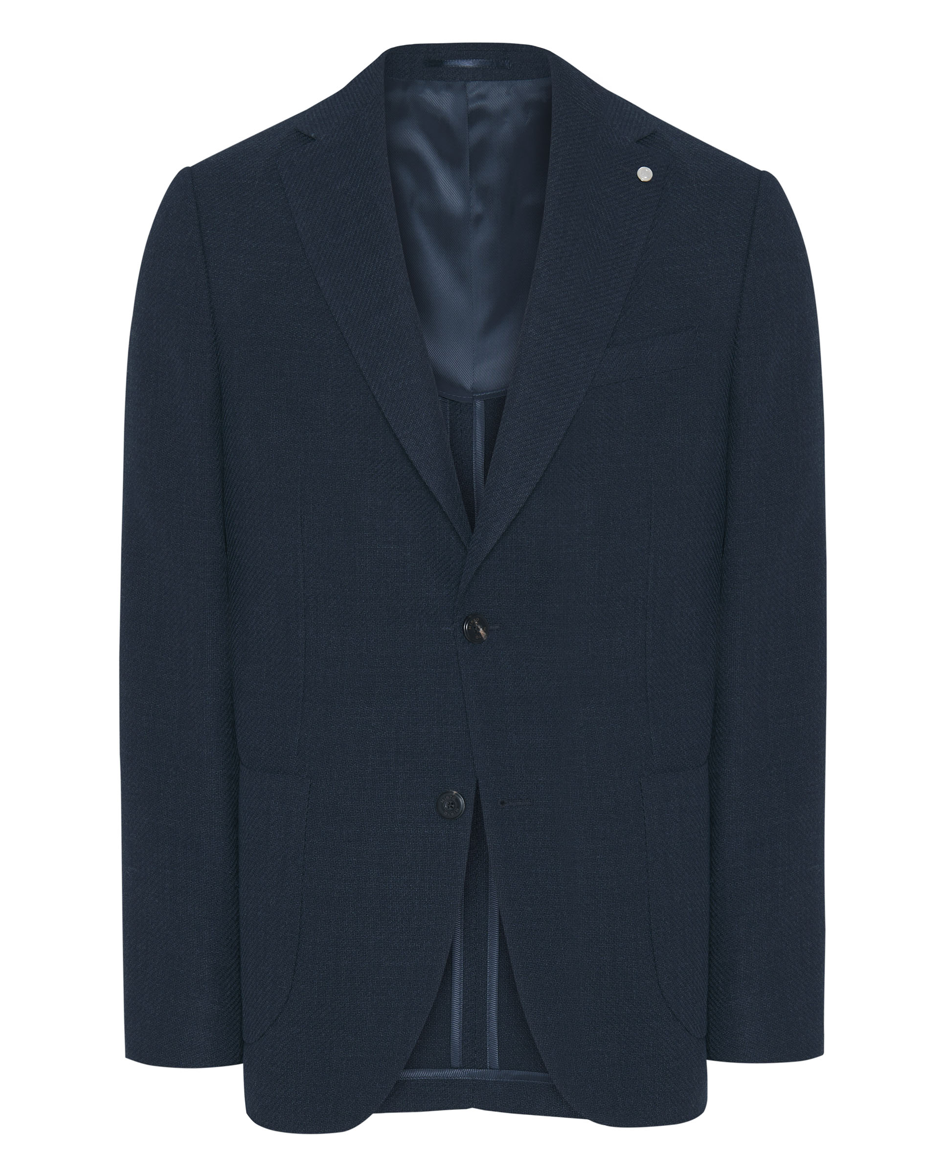 Wool knit navy blue jacket. Regular fit, fine shoulder pads, half lined. Classic lapel, single two-button closure, patch pockets.