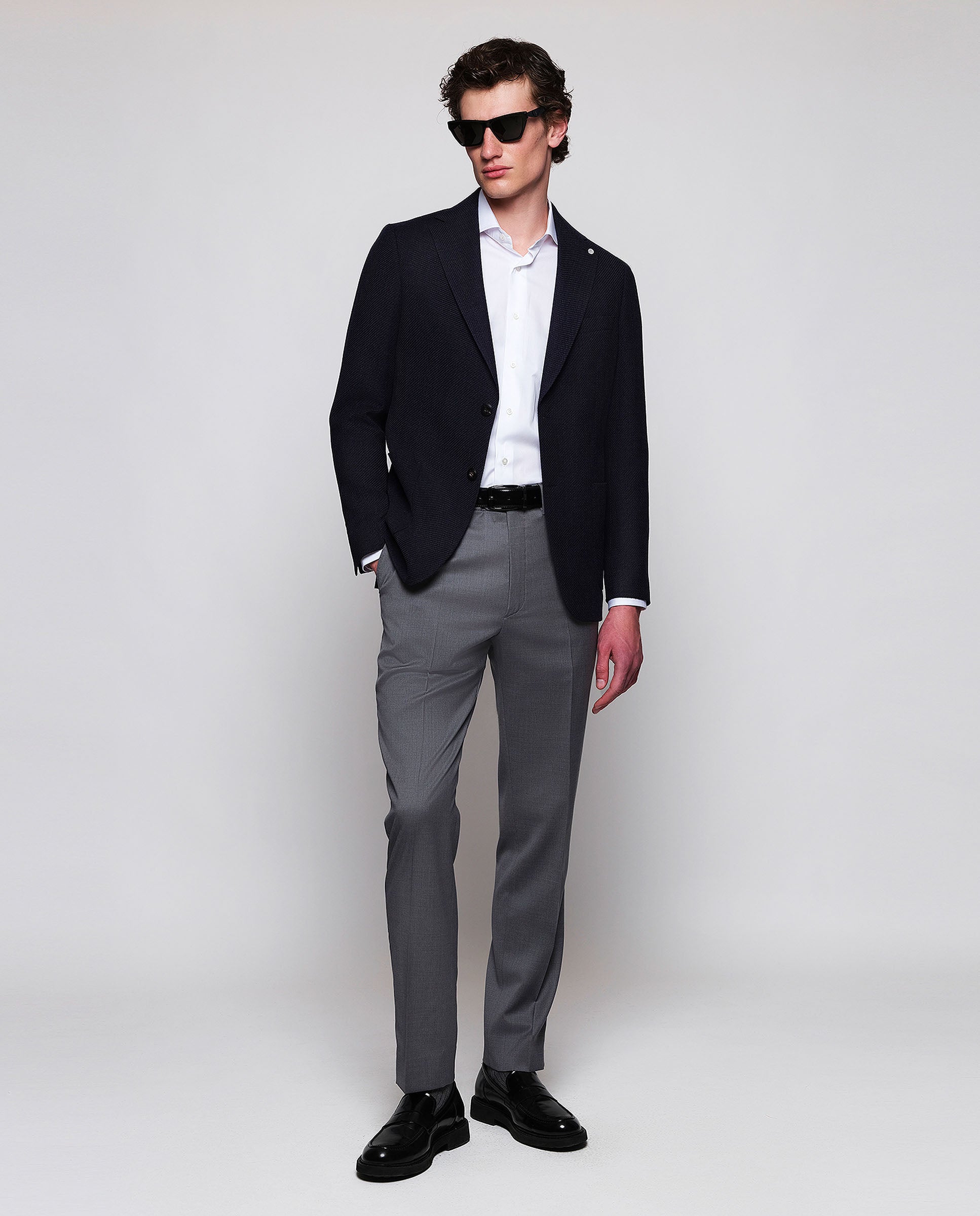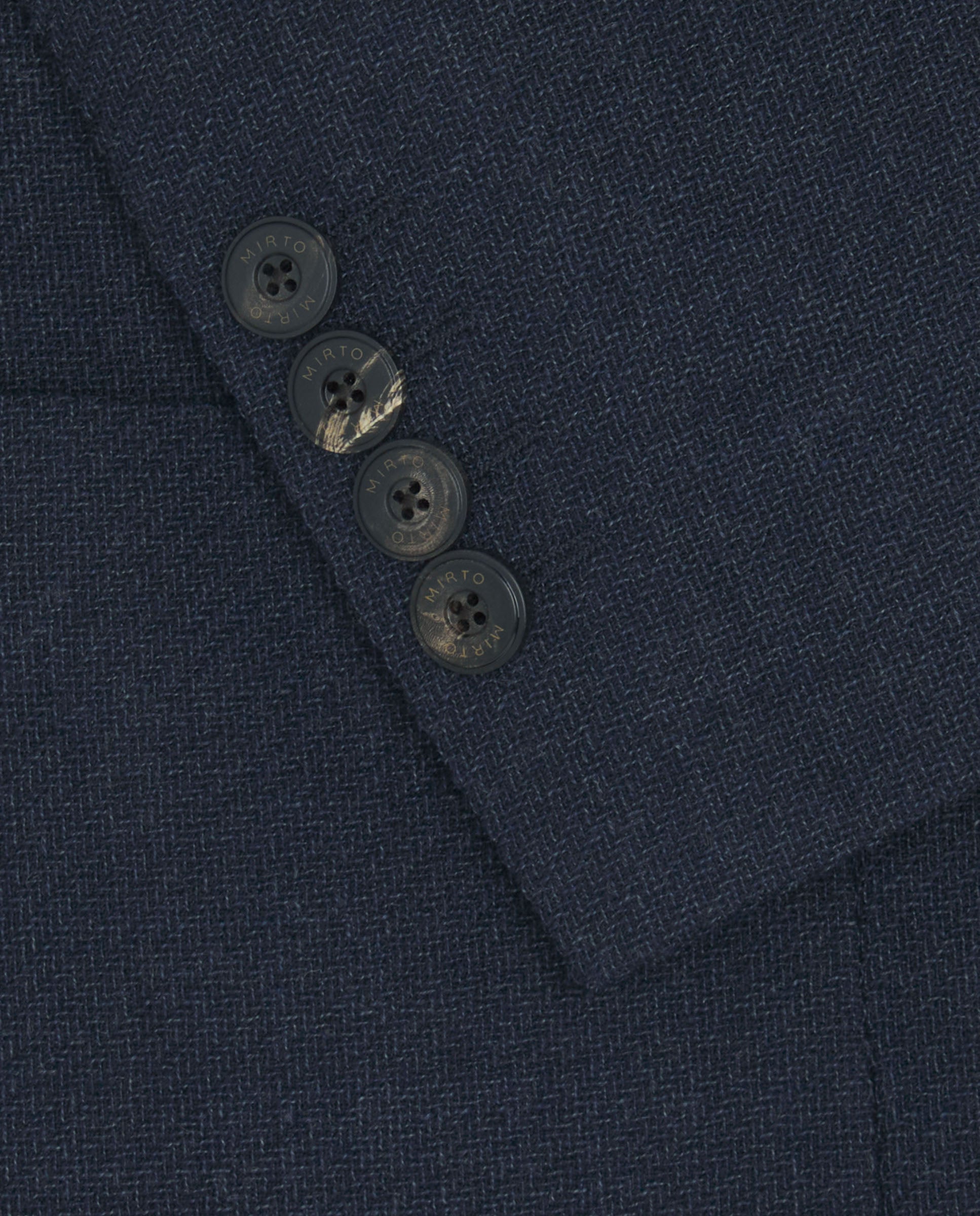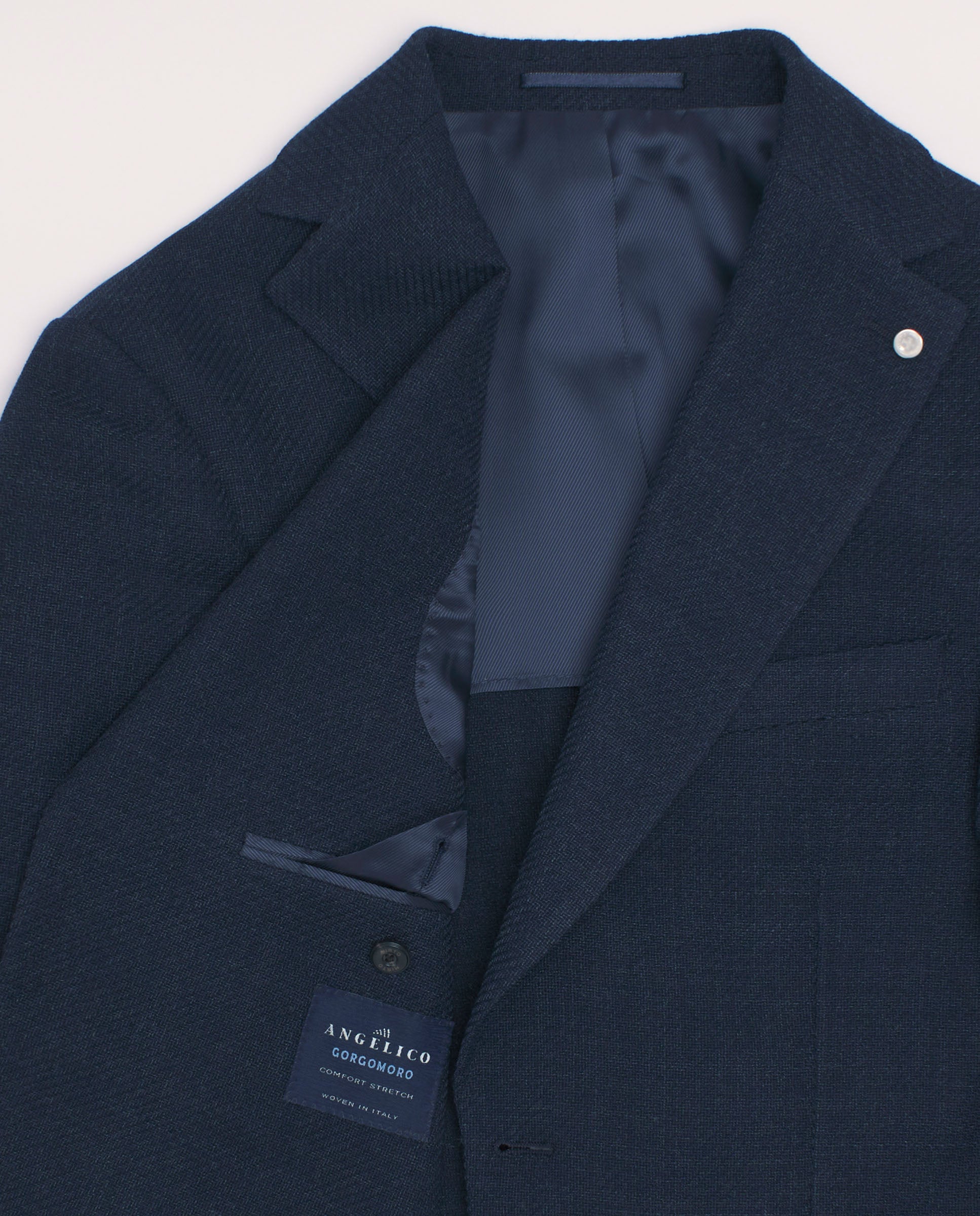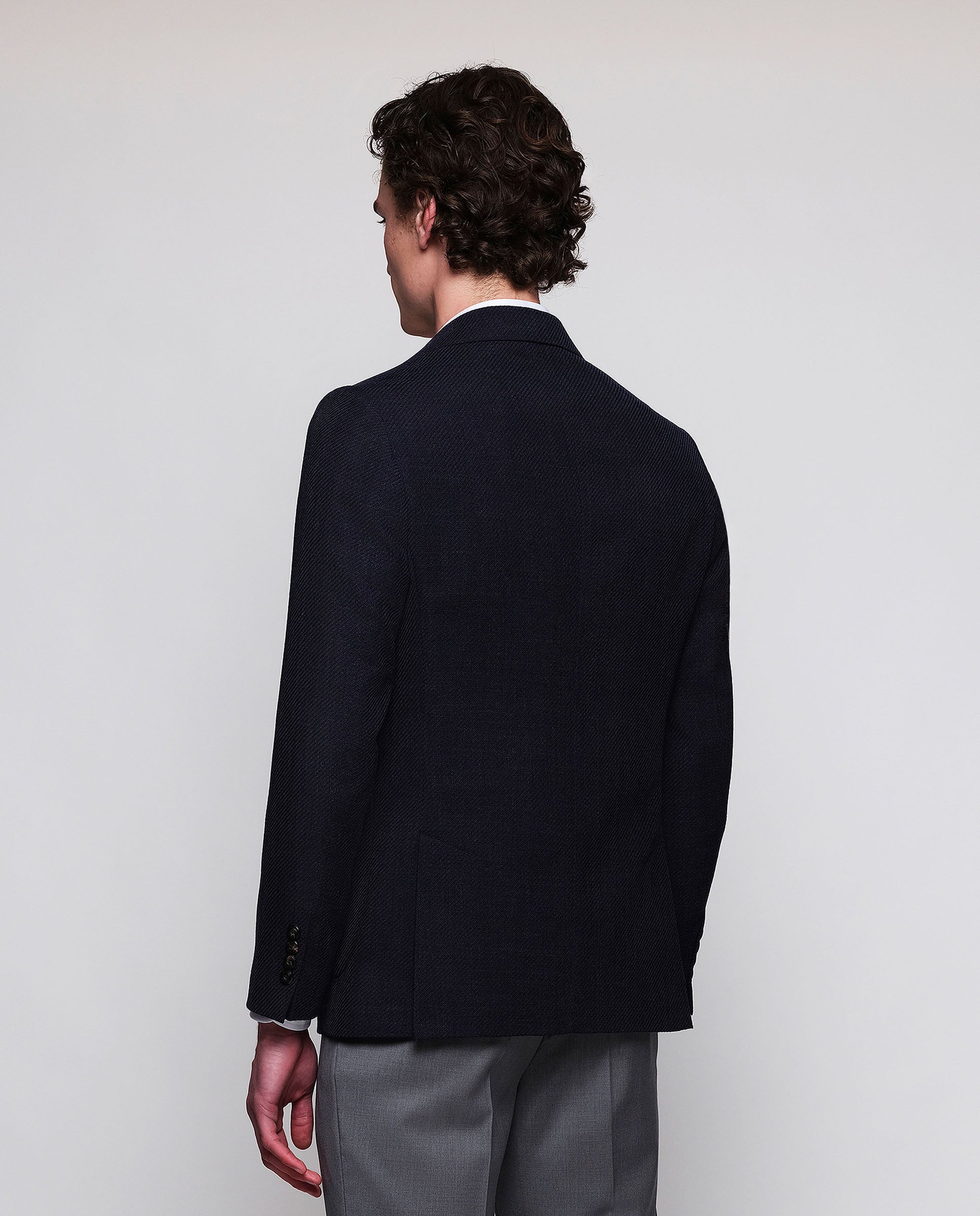 Wool knit navy blue jacket. Regular fit, fine shoulder pads, half lined. Classic lapel, single two-button closure, patch pockets.