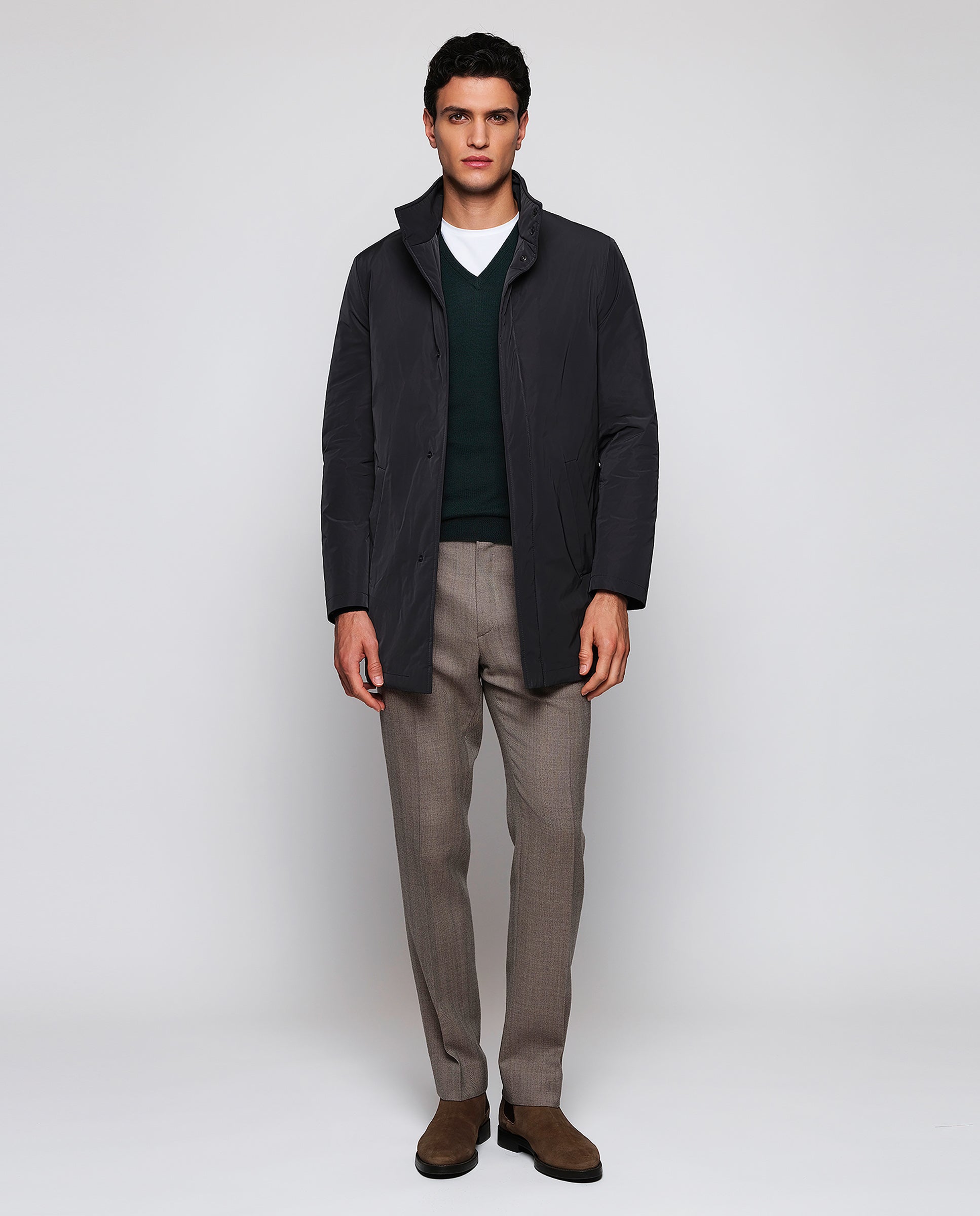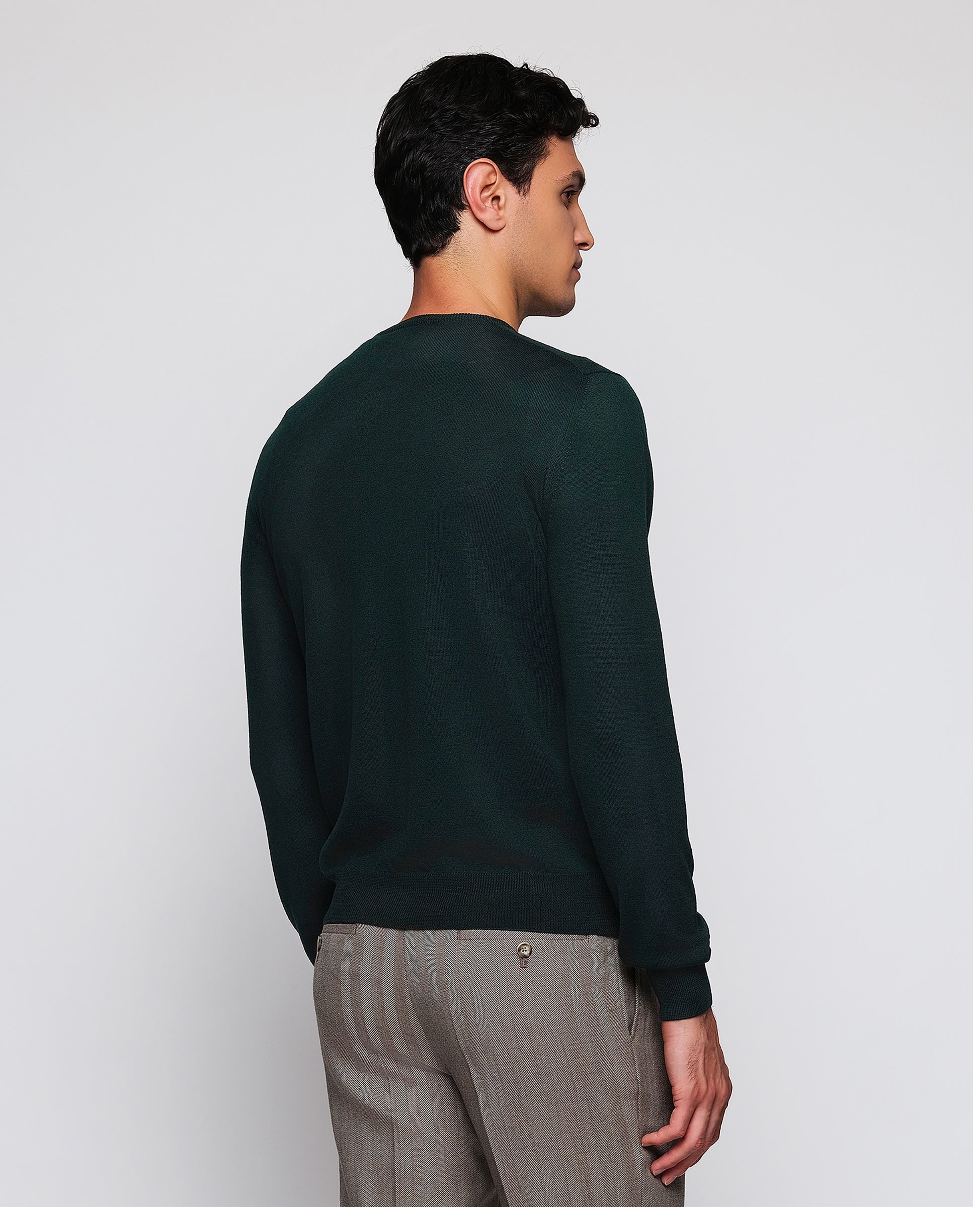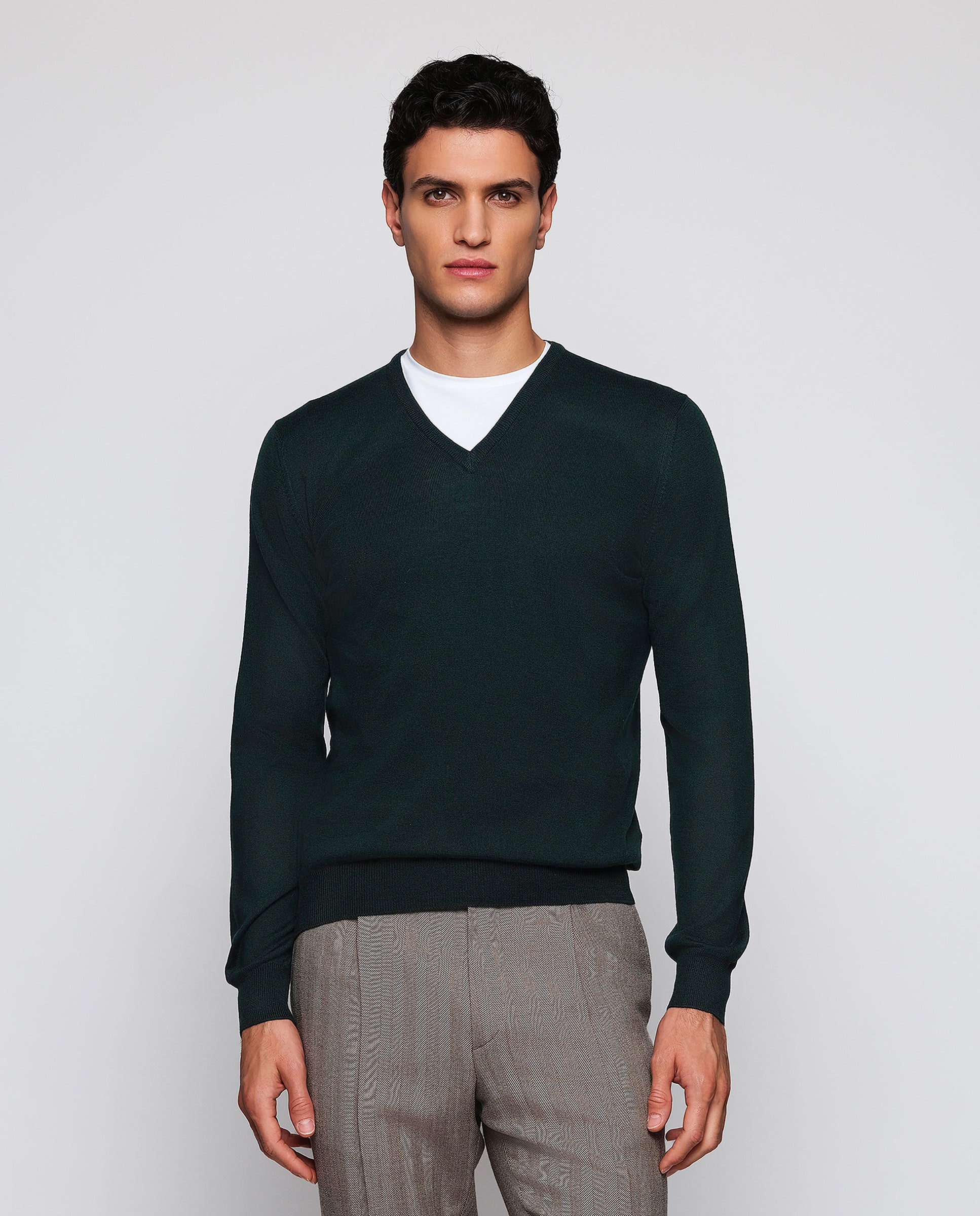Knit sweater in 100% extra-fine merino "Baruffa" wool. V-neck. Ribbed collar, cuffs and hem.