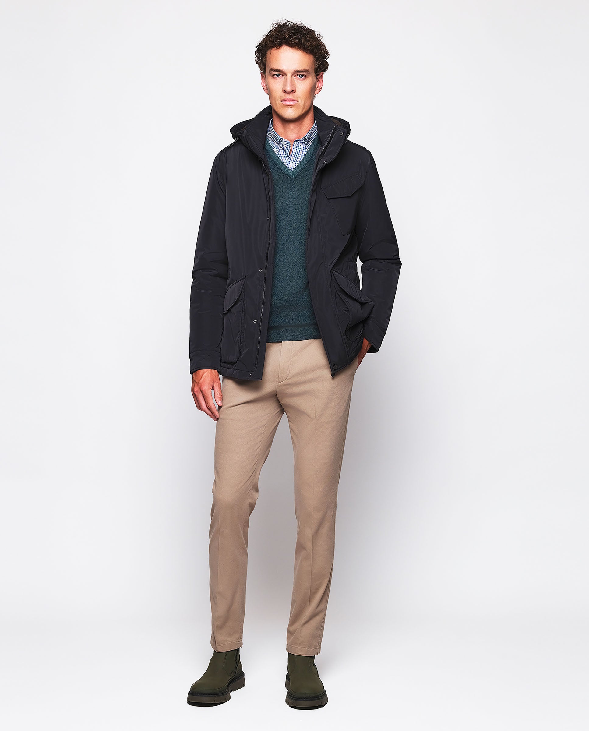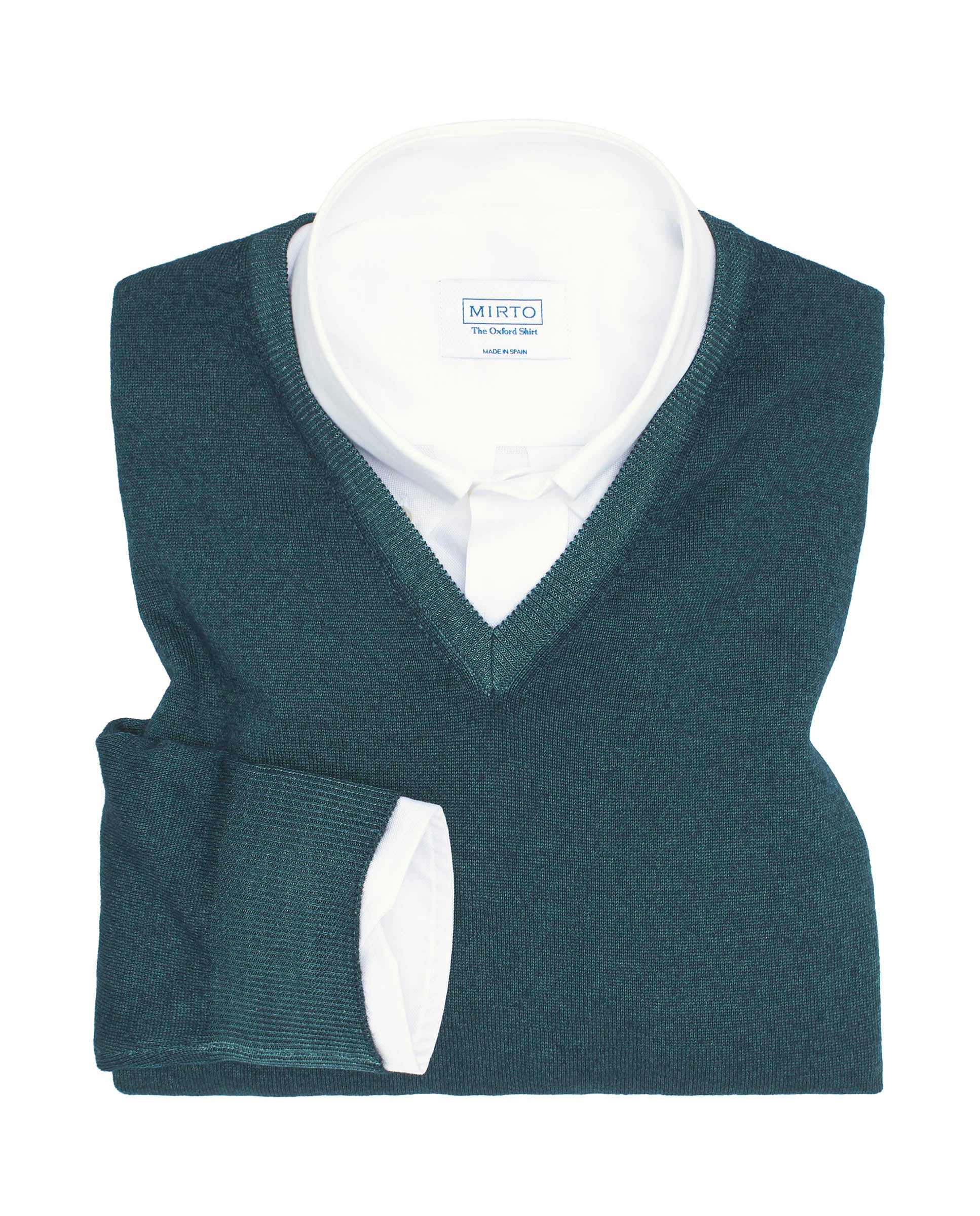 Knit jumper with V-neck in 100% washed merino wool. Ribbed collar, cuffs, and hem feature a subtle distressed effect. Combining premium softness with urban edge, it?s the perfect statement piece for modern casual wear.