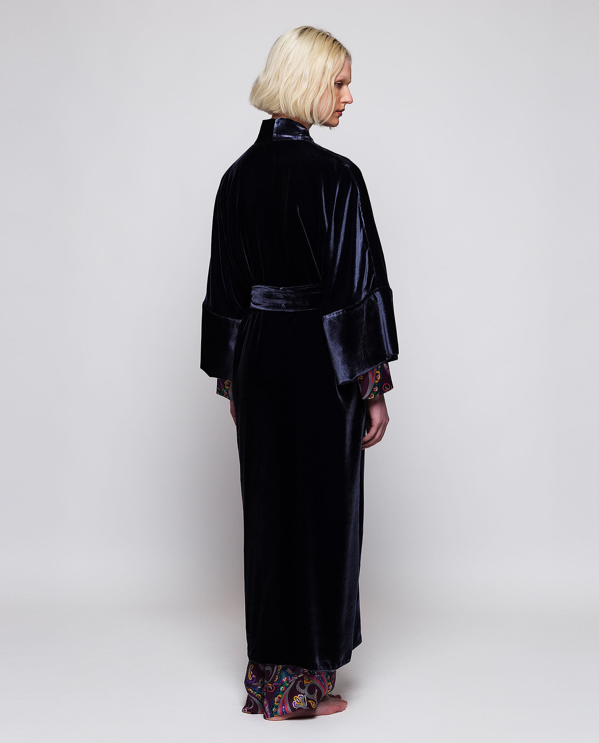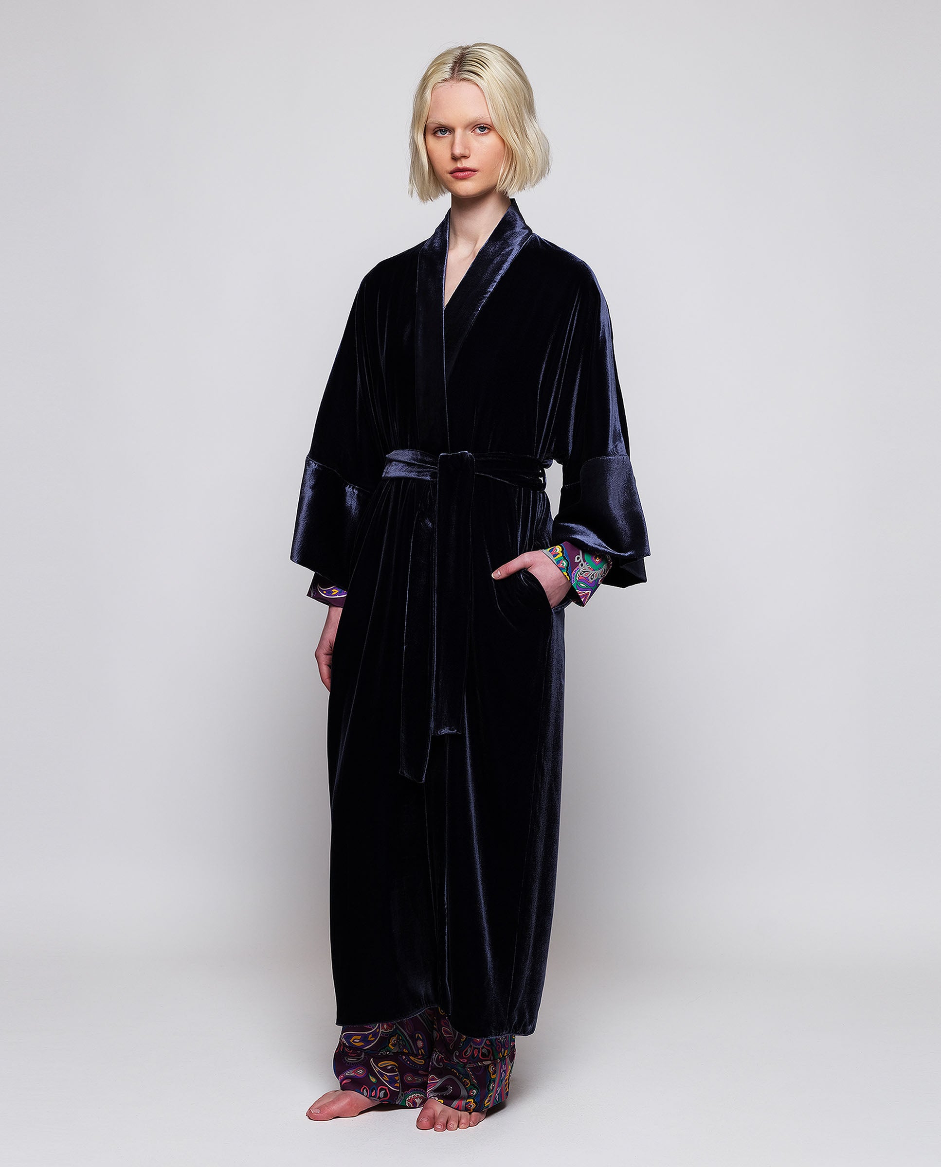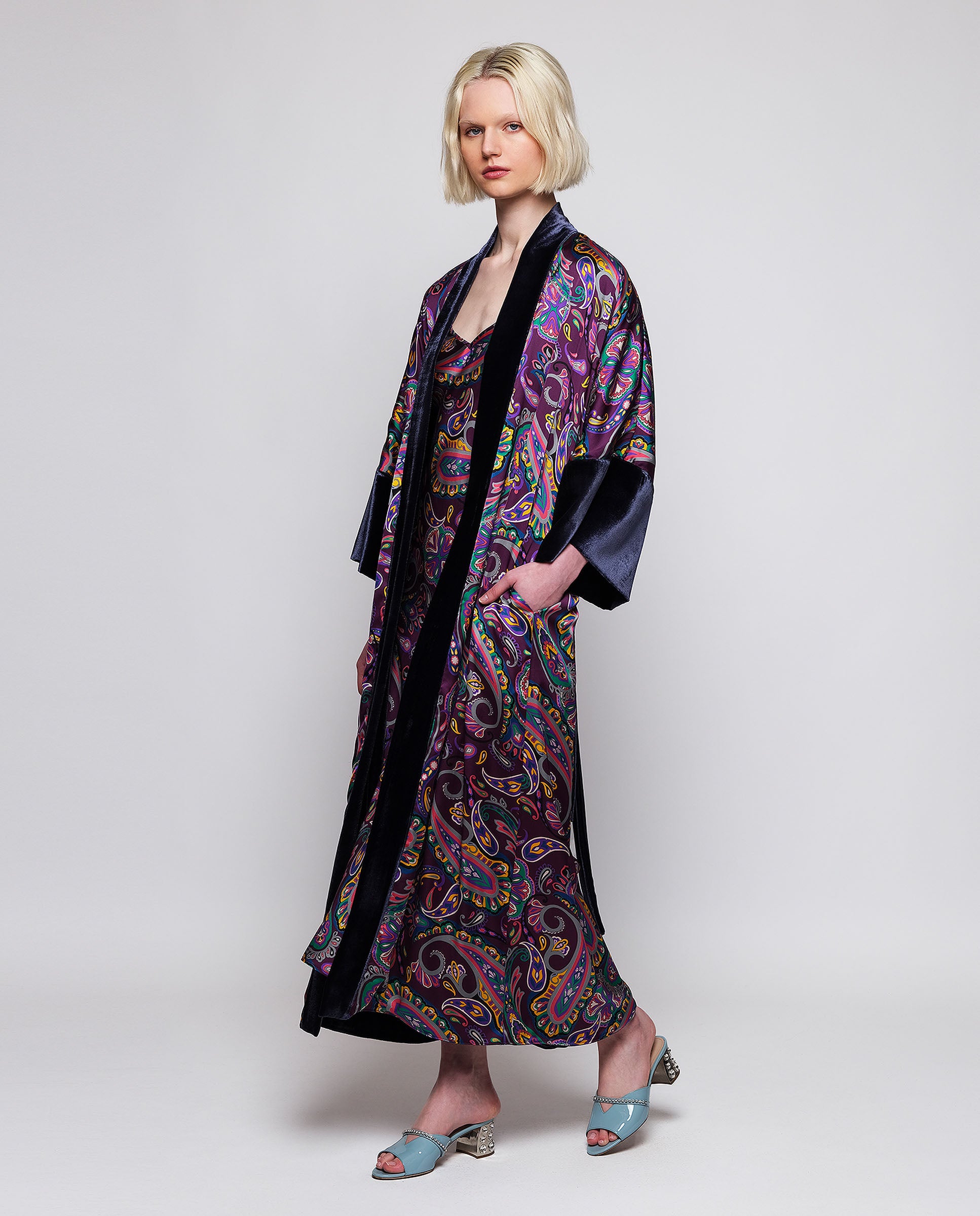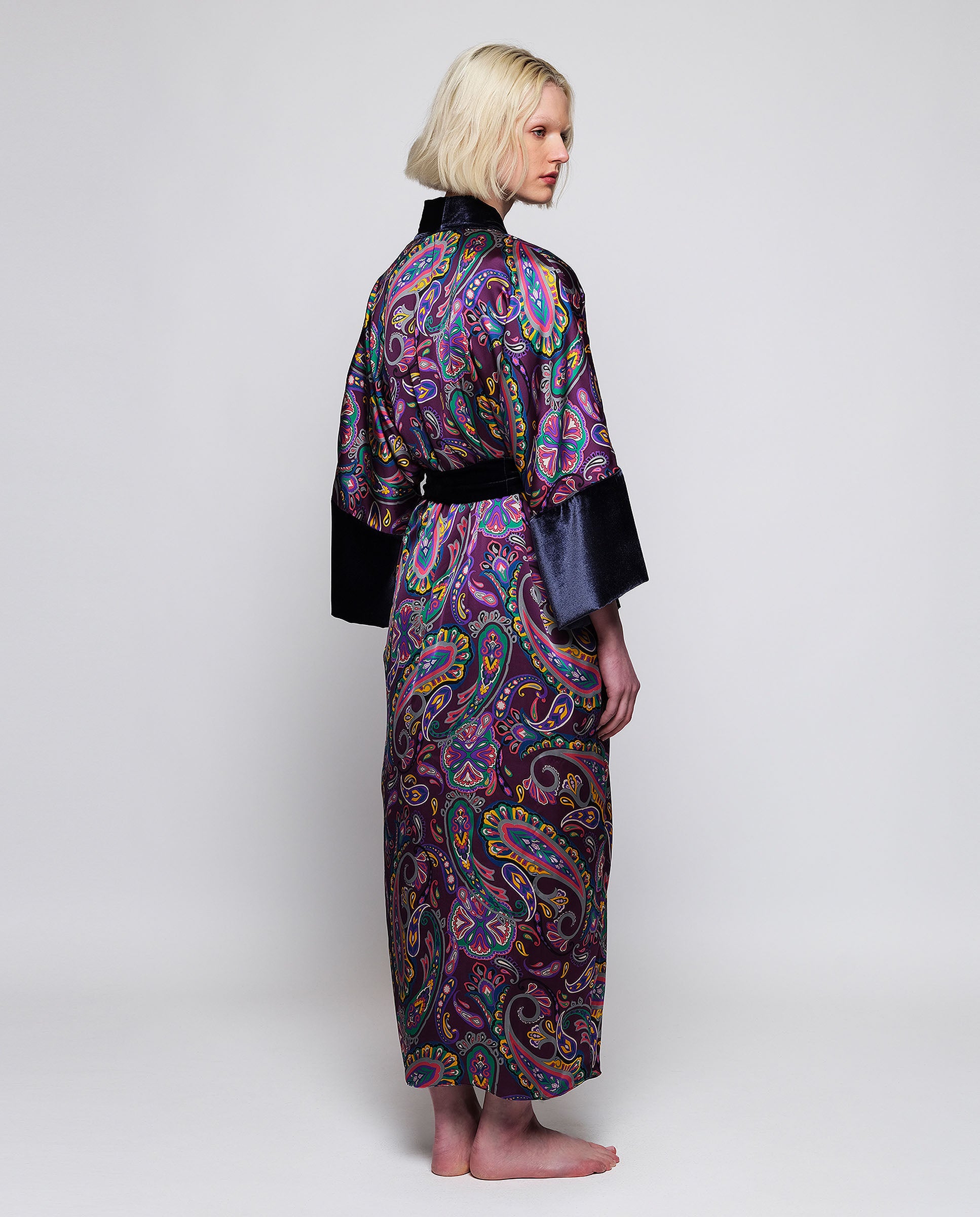 Velvet paisley print reversible long kimono. Velvet appliqués in collar & cuffs. In between seams pockets. Belt included. A very versatile garment. To wear with sophisticated ease inside and outside your home.