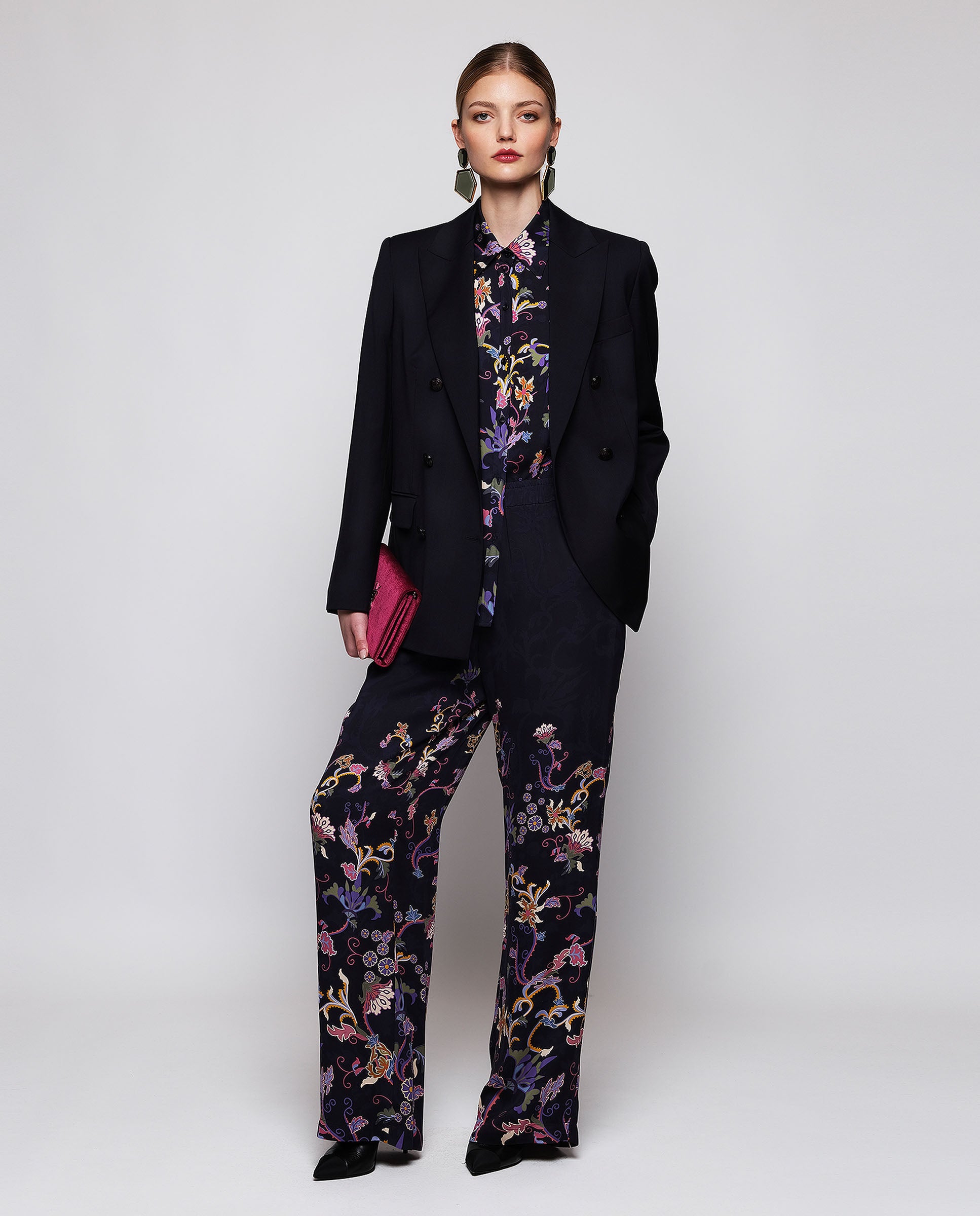 Fluid blue trousers with positioned floral print. Elastic waistband, side pockets with invisible zips. Straight fit. A unique model th at harmonizes distinction and comfort during every step of your life.