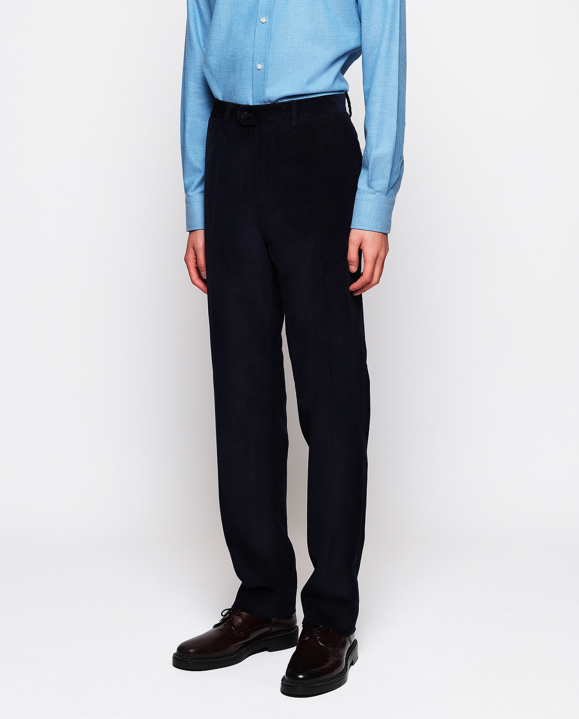 Navy blue dress trousers in cotton microcorduroy. Elegant garment that also adds warmth. Regular fit, no darts, slant pocket & back pocket with buttons. Sartorial closure & inner details in shirt fabric.