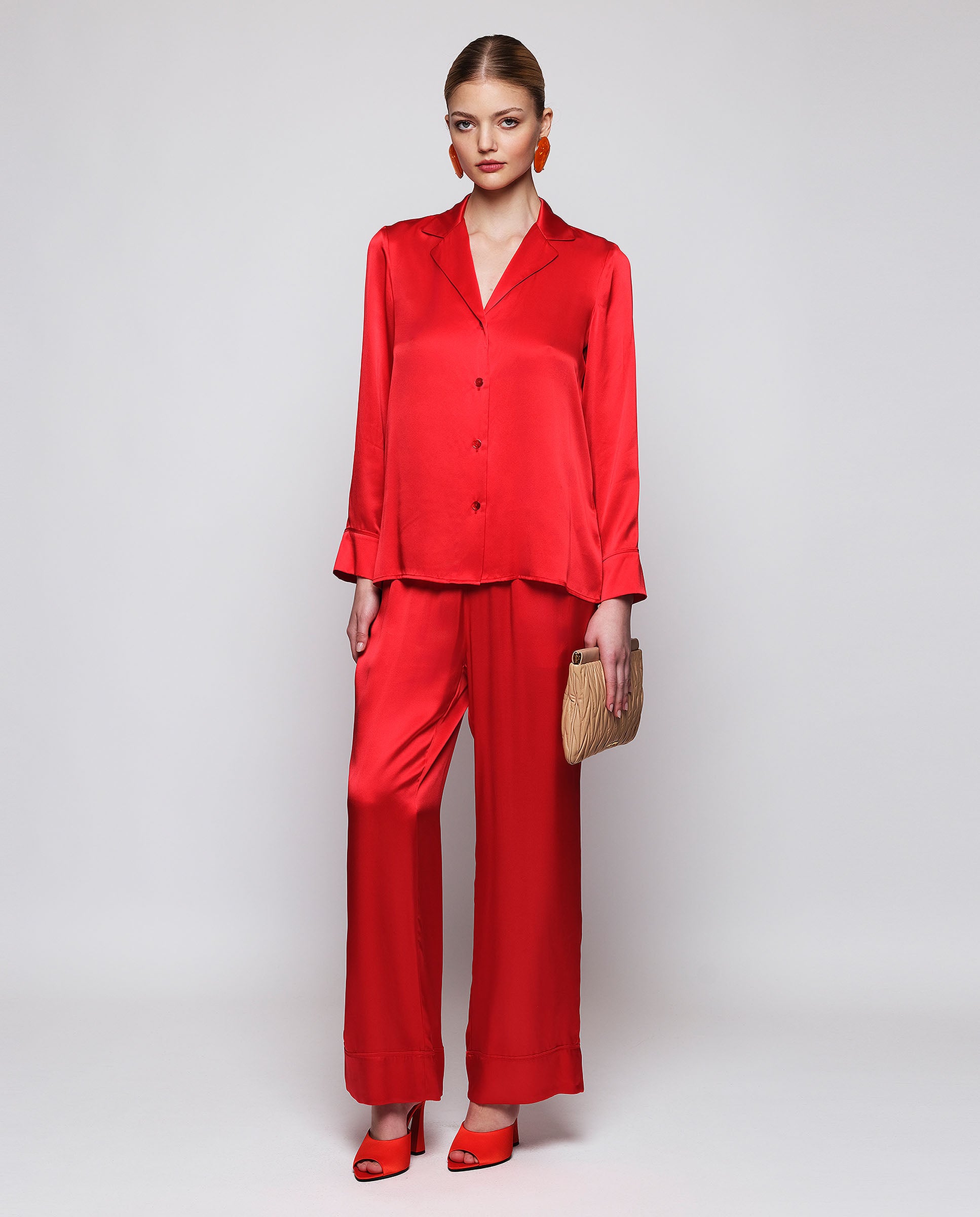 100% silk long, red pajamas. Shirt with collar, lapels, & button fastening. Pants with elastic waistband & side pockets. Piping detail in same fabric. A vibrant shade, a fabric with a luxurious feel, softness, and stand out style.