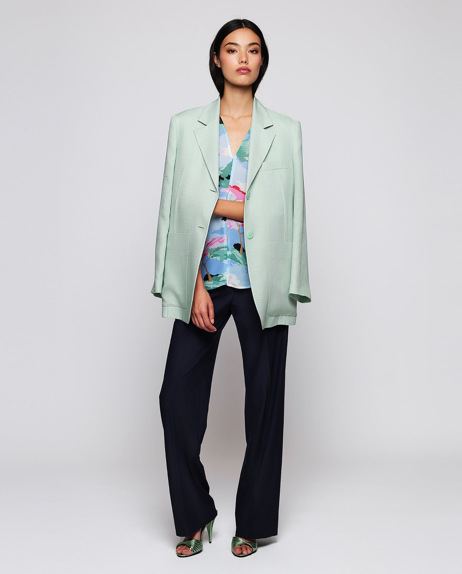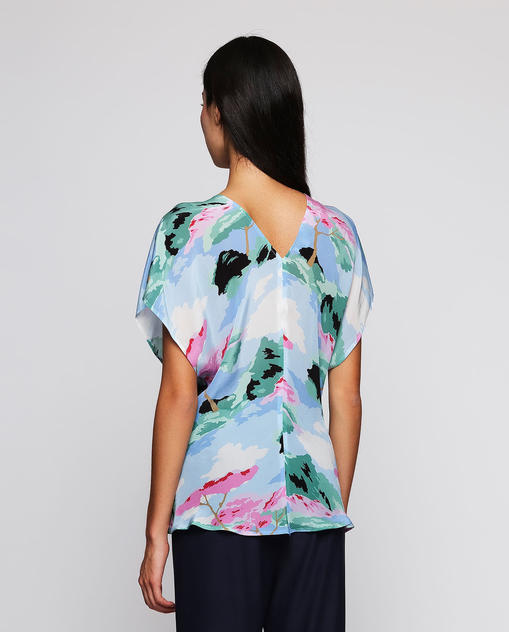 Fluid landscape print blue top. V neckline in front & back, short sleeves. Fitted.