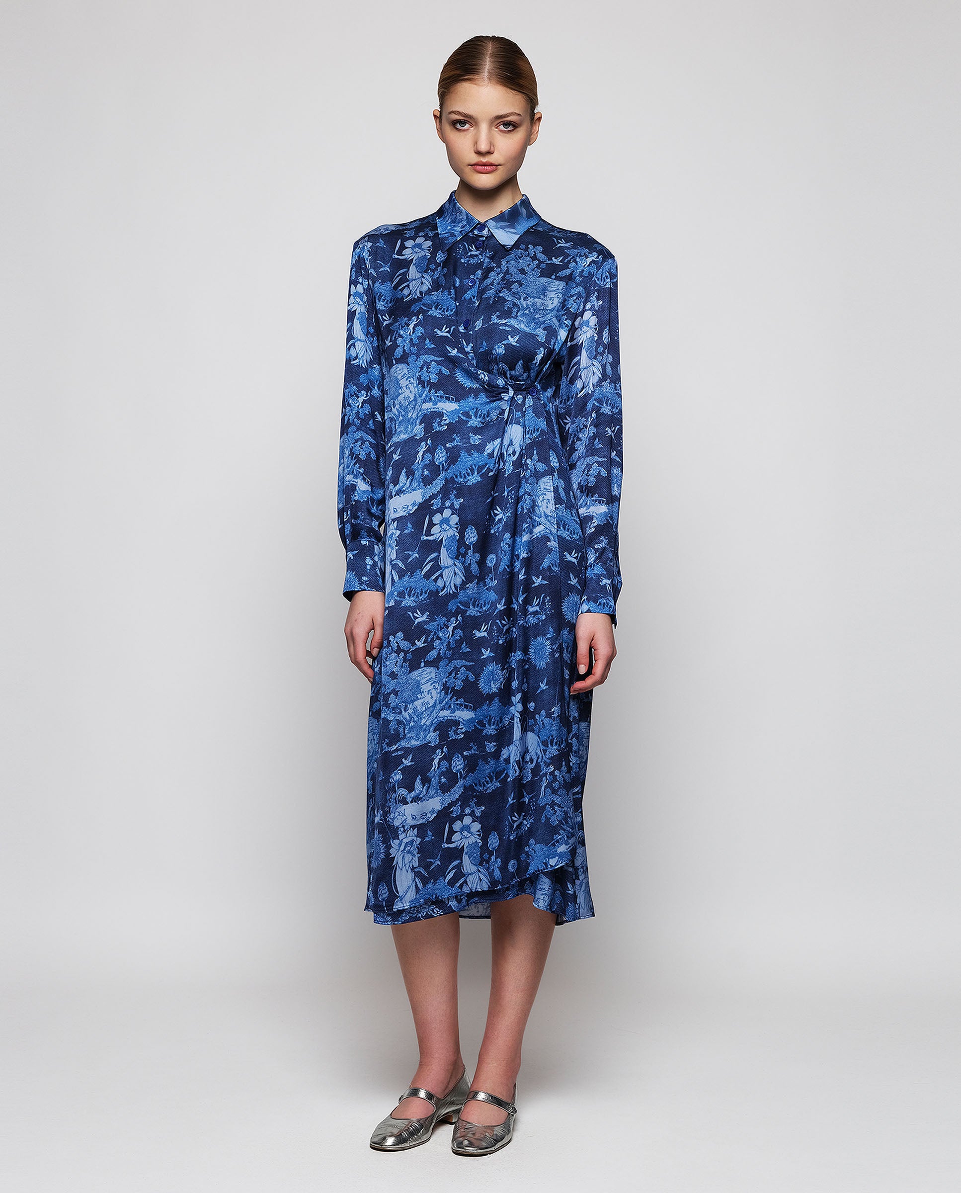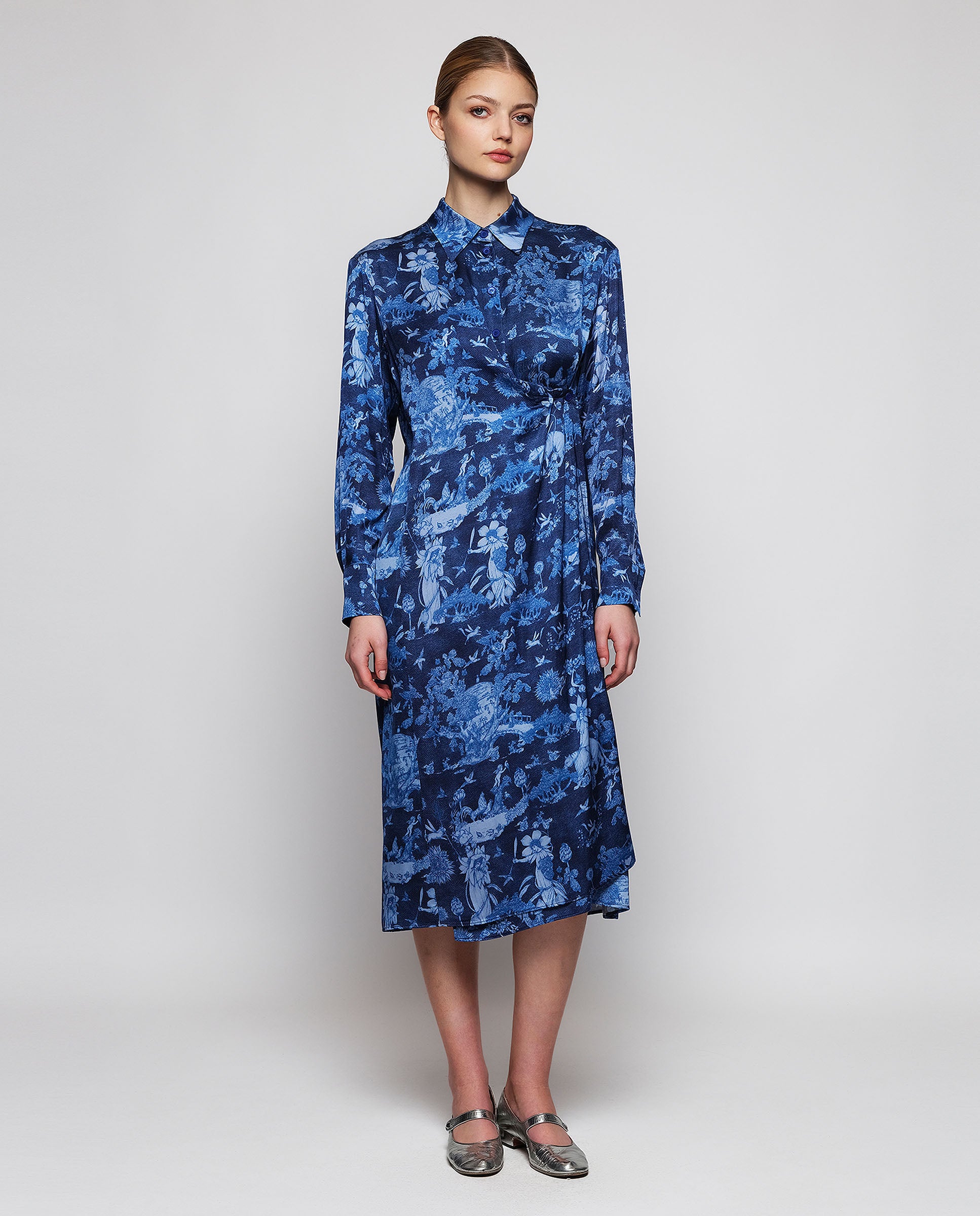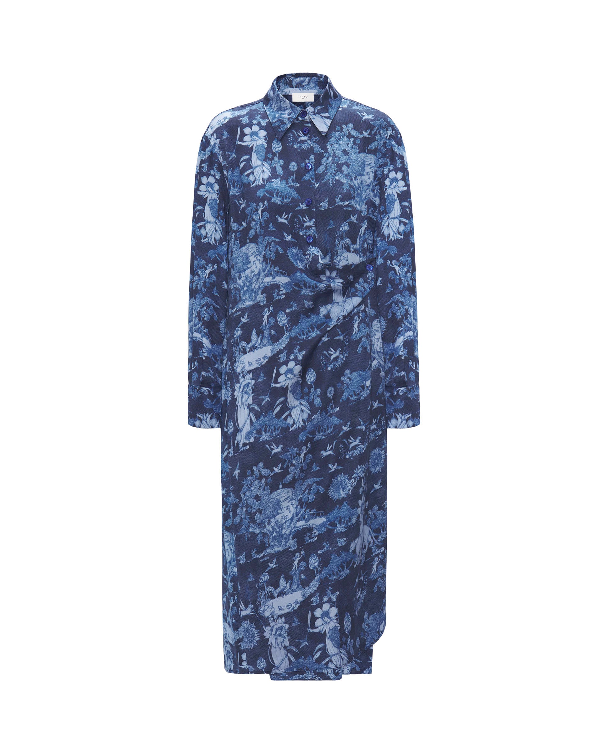Midi, fluid shirt dress with exclusive toile de jouy print designed exclusively by MIRTO in collaboration with watercolor botanist Sena Cifuentes. Collar, cross-over fastening with buttons. Draped at waist. Straight fit.
