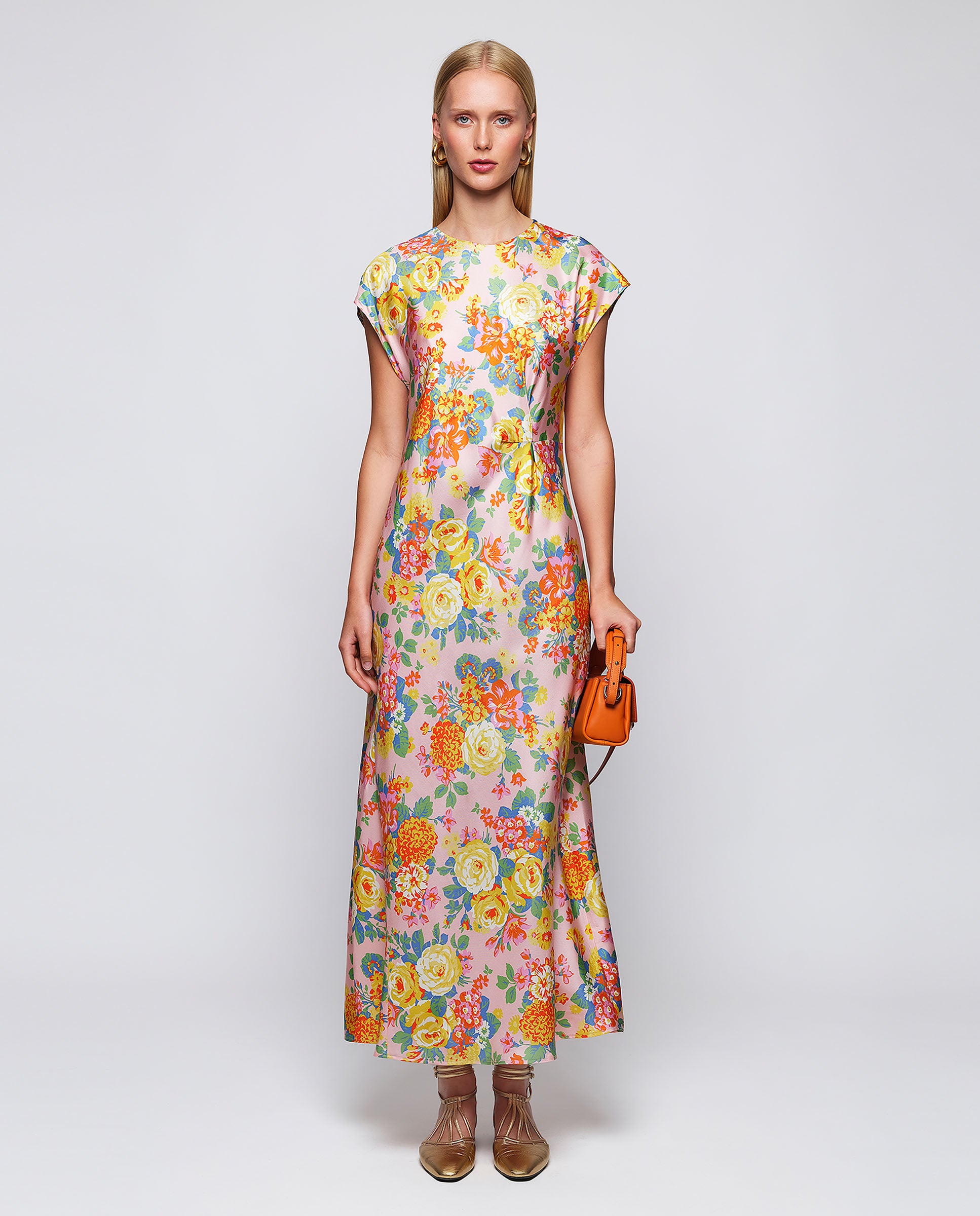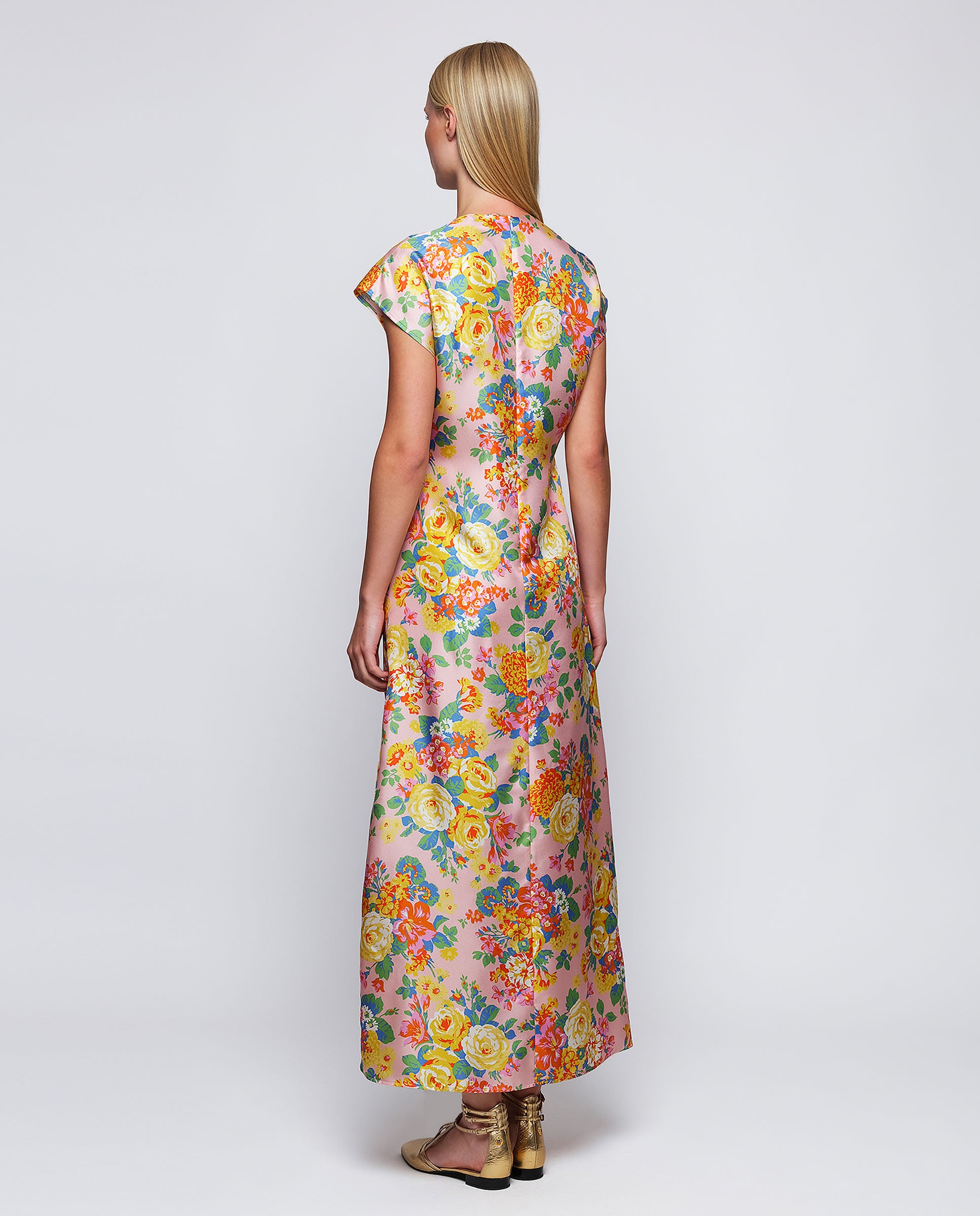 100% Liberty silk twill floral print long dress. Round neckline, invisible back zip, no sleeves. Draped detail at waist. Semifitted with subtle flare.
