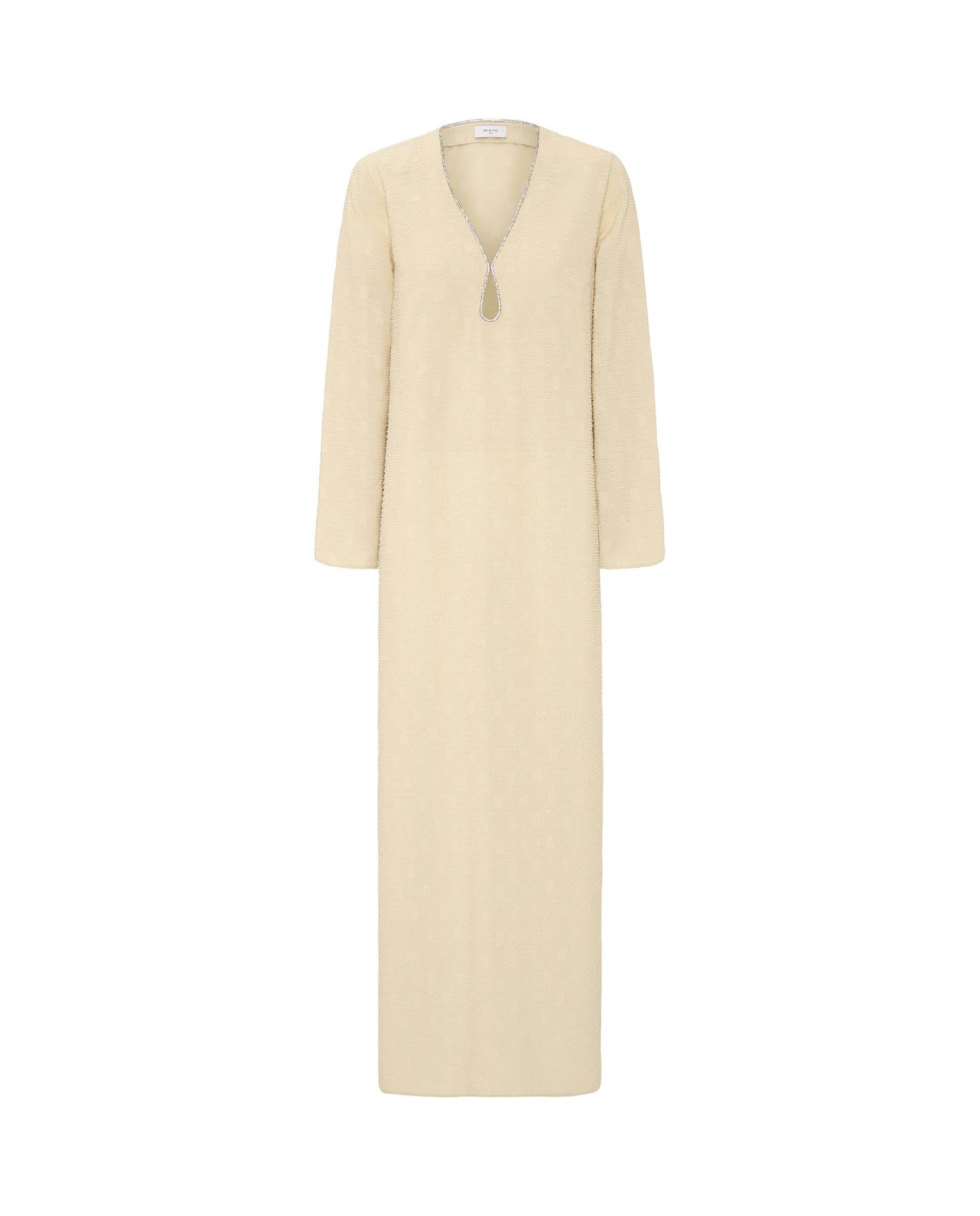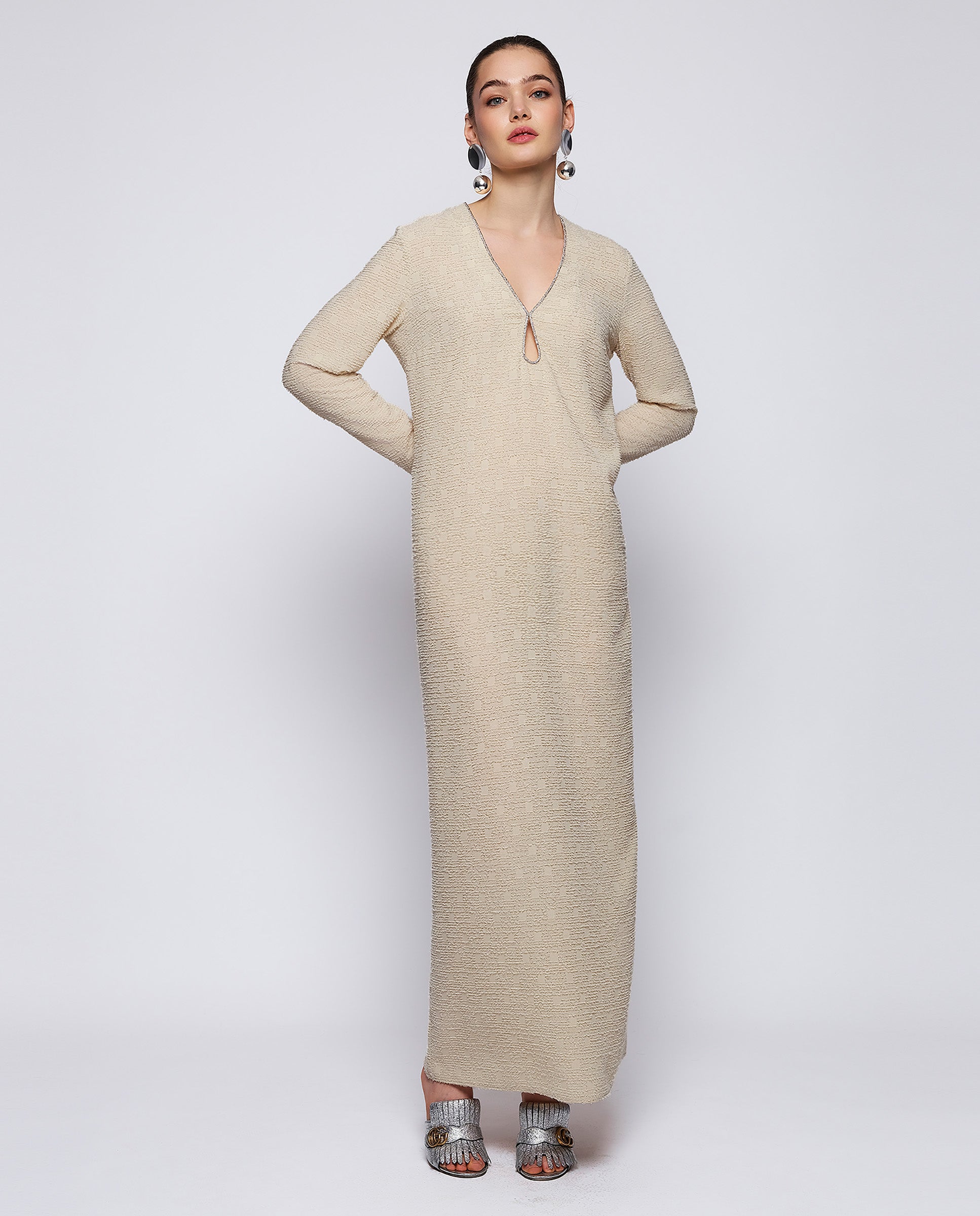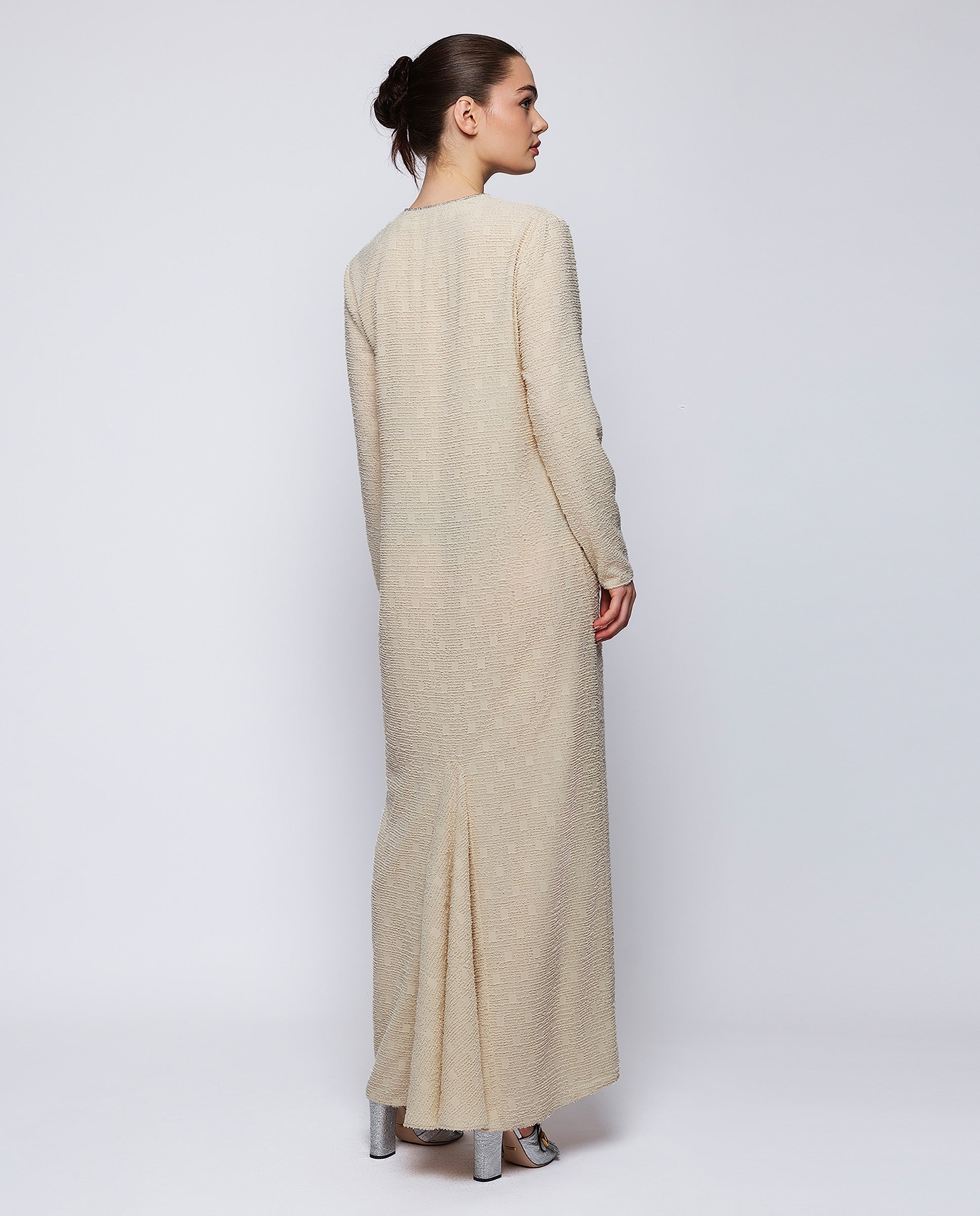 Long fil coupé dress with metallic thread details. Neckline with fancy strass ribbon, long sleeves, & godet at the back. A sophisticated dress, delicately created with handcrafted details. Perfect for special occasions.