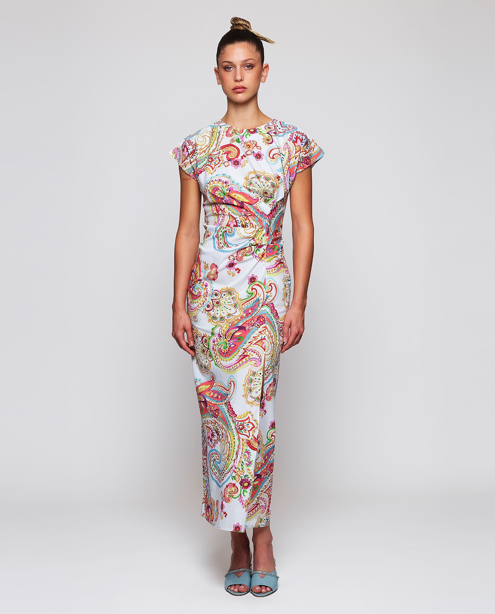 Stretch cotton multicolor paisley print white midi dress. Round neckline, draped side detail. Invisible back zip, side opening. Fitted.