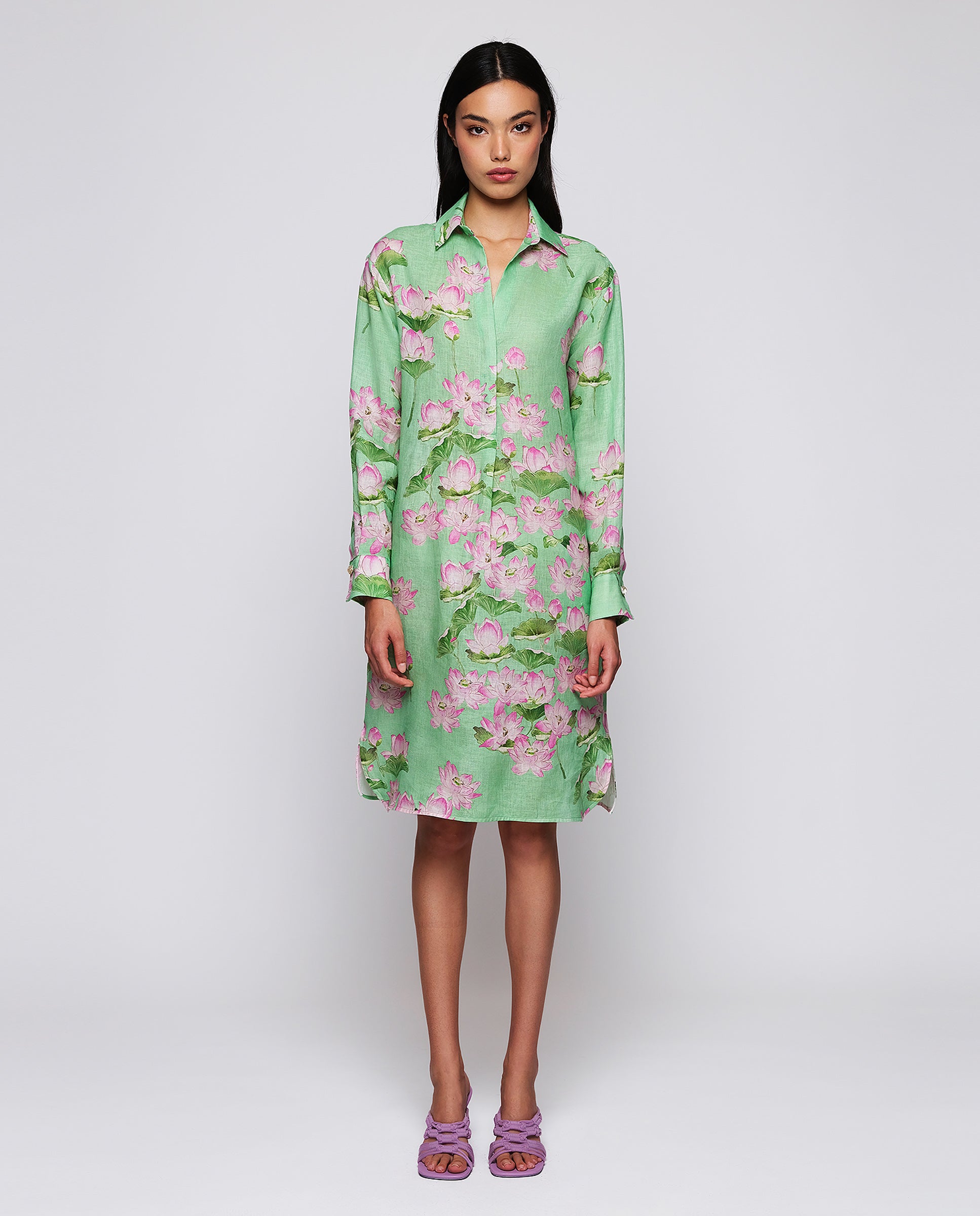 100% linen floral print green short dress. Coller, half open with placket & buttons. Long sleeves, cuffs with artisanal buttons. In seams side pockets. Straight fit.