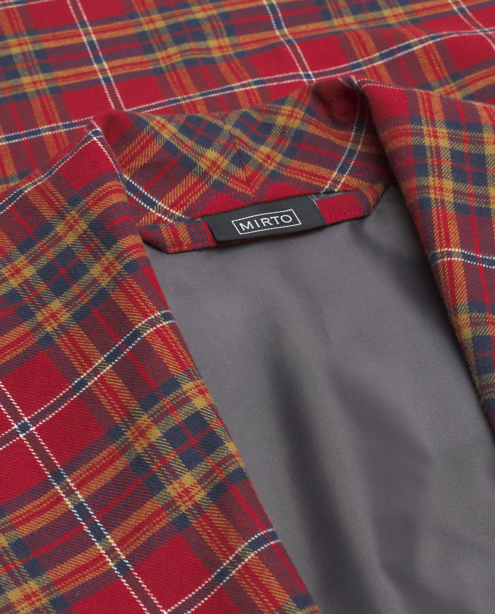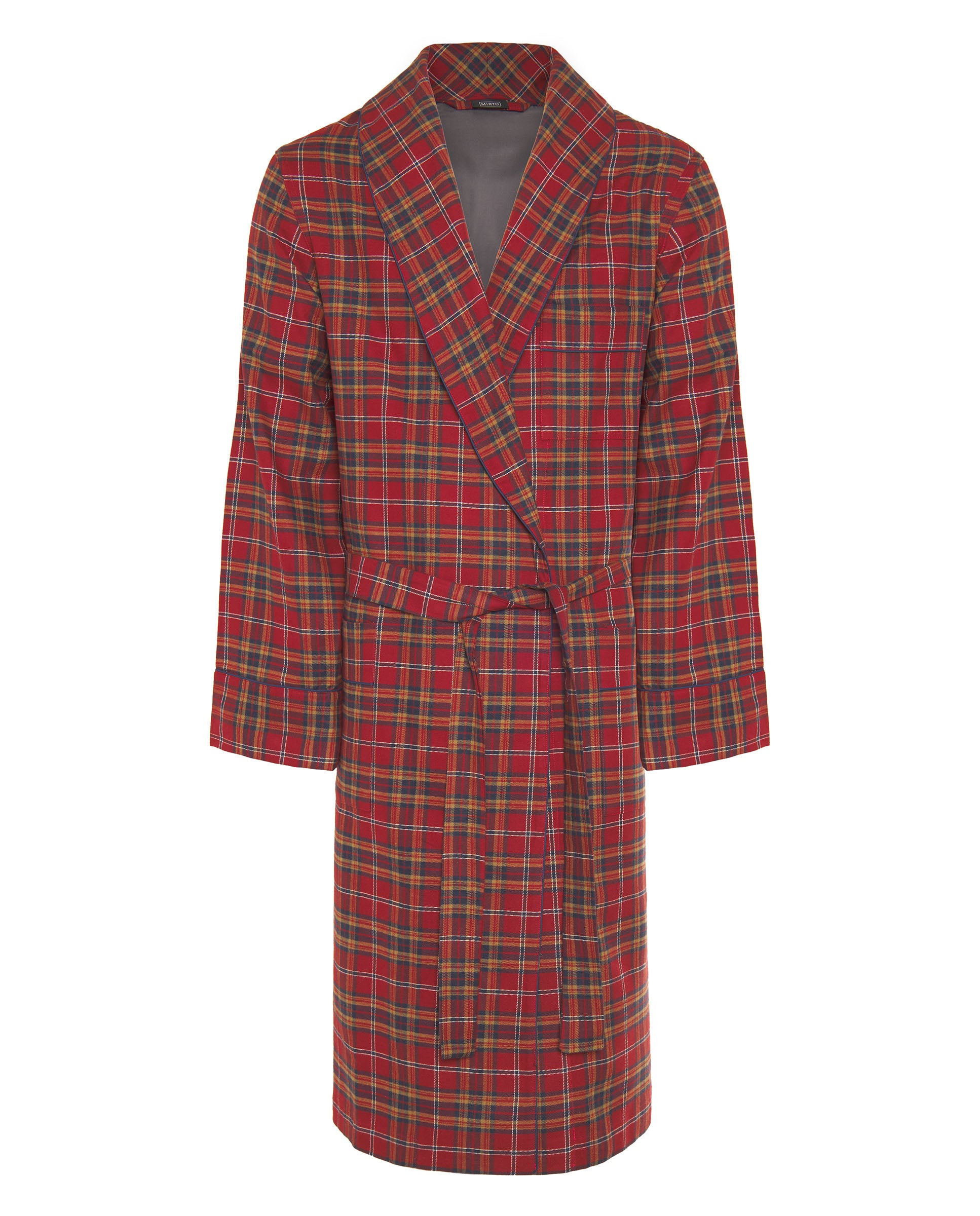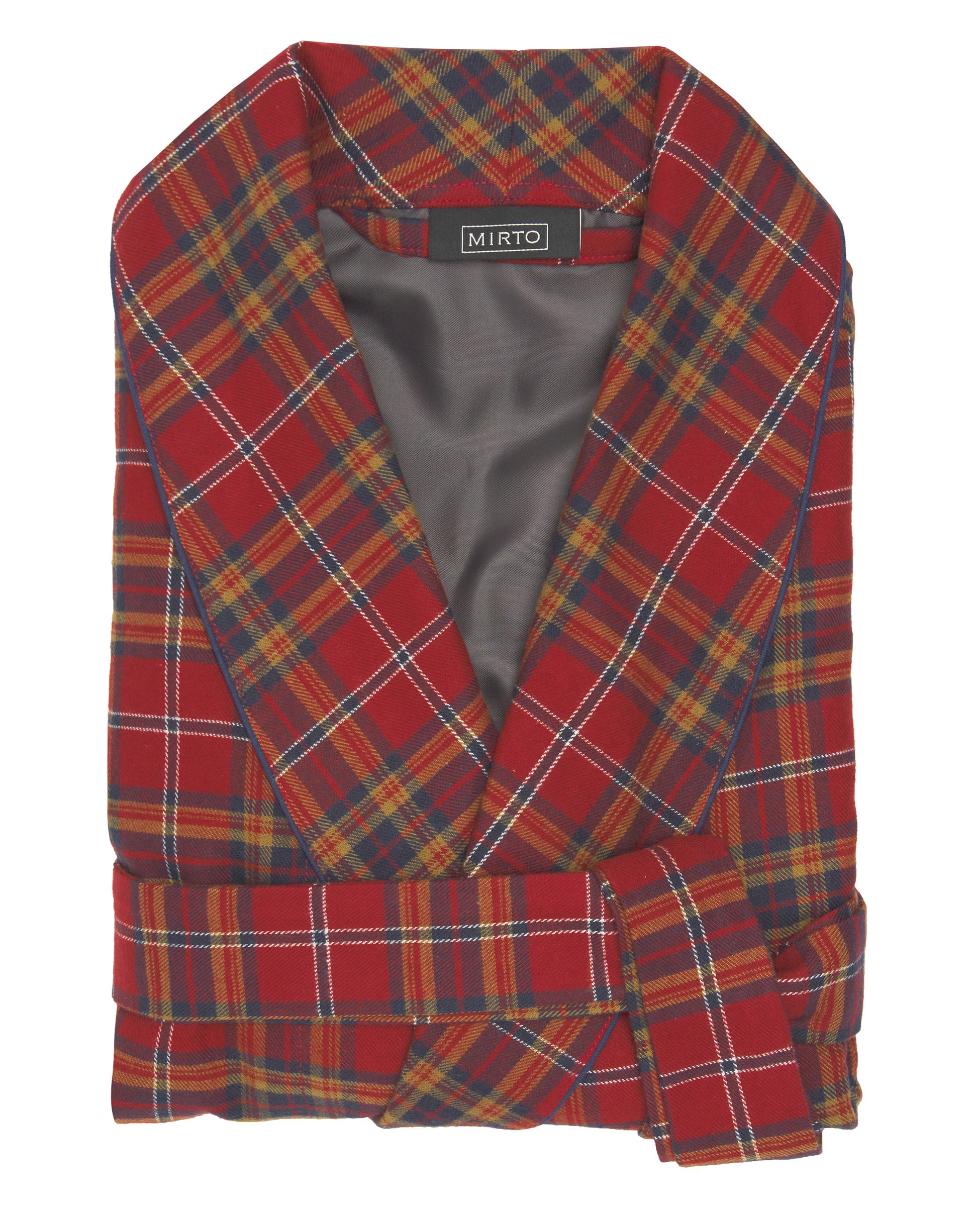 Bata cruzada de cuadros escoceses de franela 100% algodón. Cuello con solapa, tres bolsillos, vivos azules y cierre con cinturón.