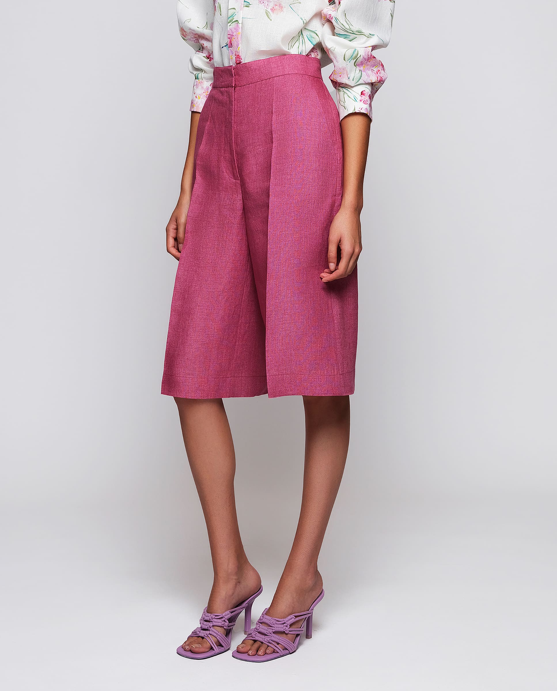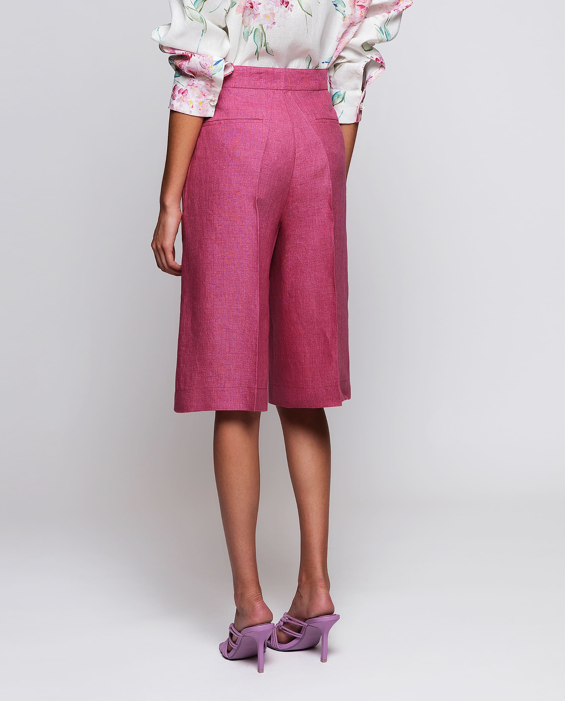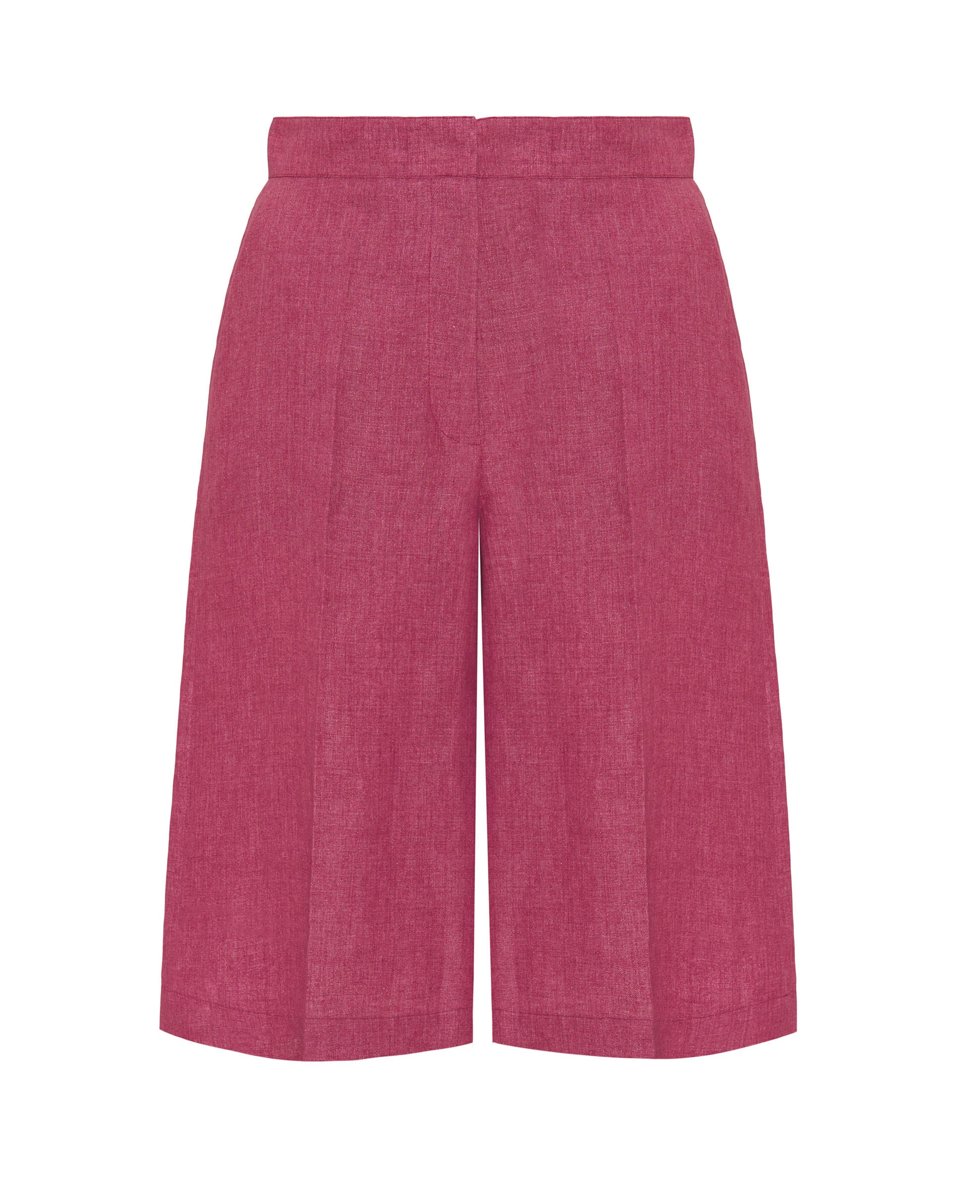 Bermuda fresa de lino 100%. Tiro alto con cinturilla. Cierre oculto con cremallera, gancho y botón. Dos bolsillos laterales y dos de ribete en parte trasera. Fit recto. Pliegue planchado en centro delantero.