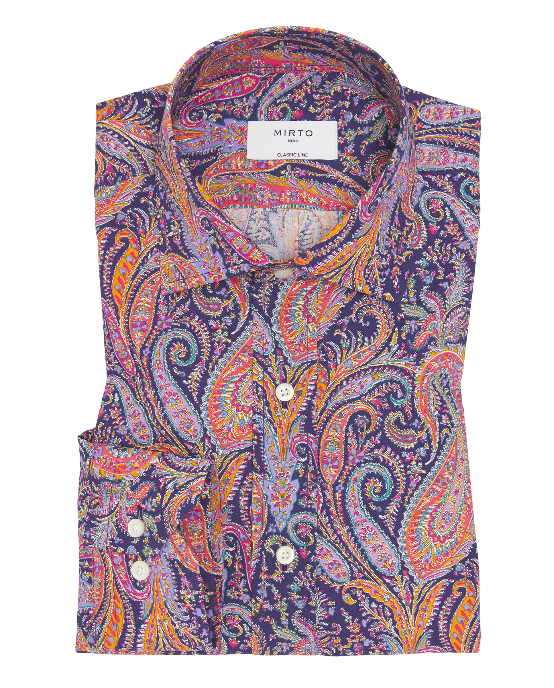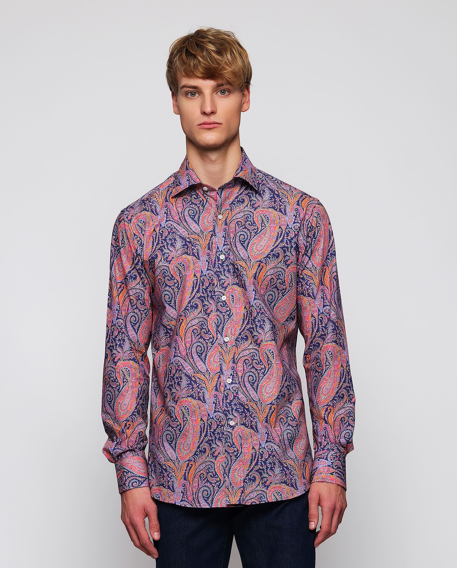 Camisa casual estampado paisley Liberty 100% algodón, cuello italiano soft con varillas, sin bolsillo, manga larga, puño con doble botón classic fit.