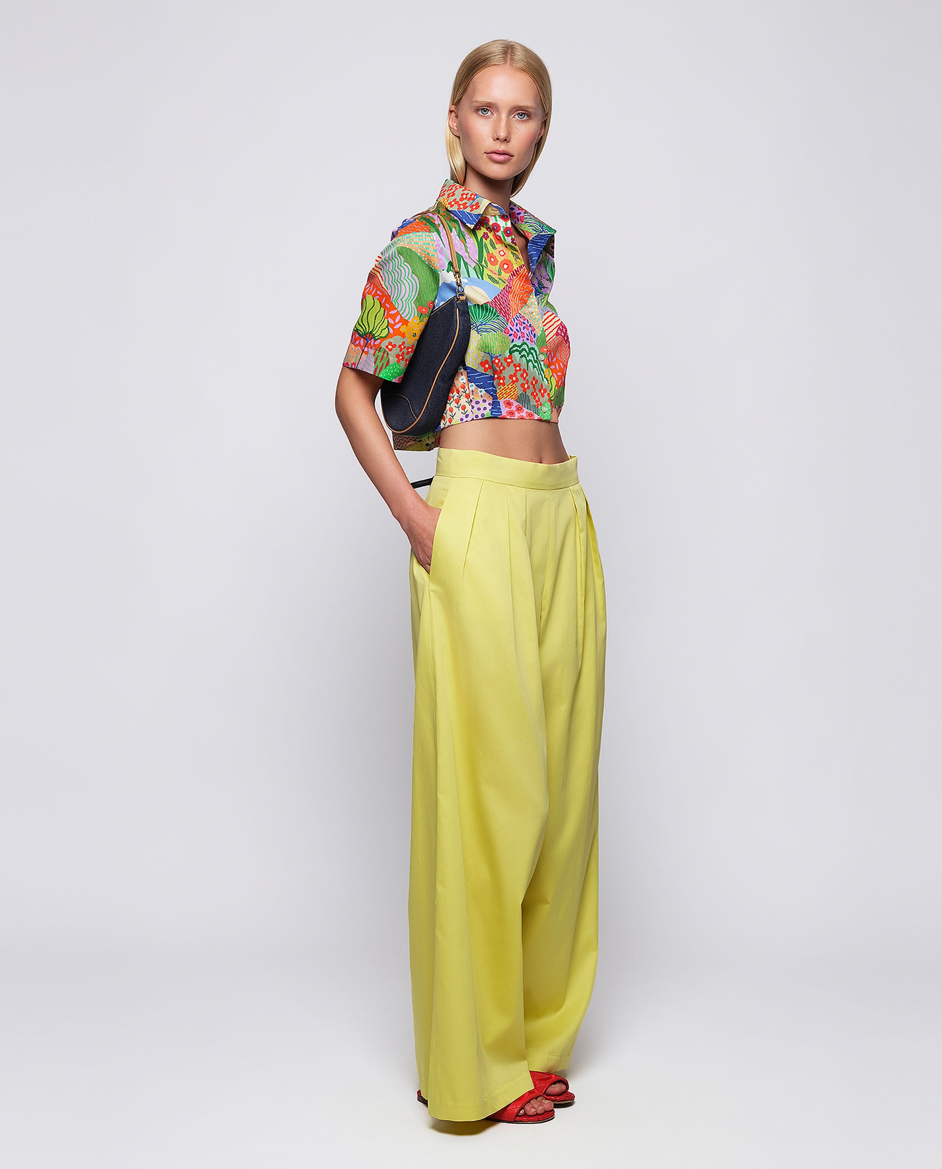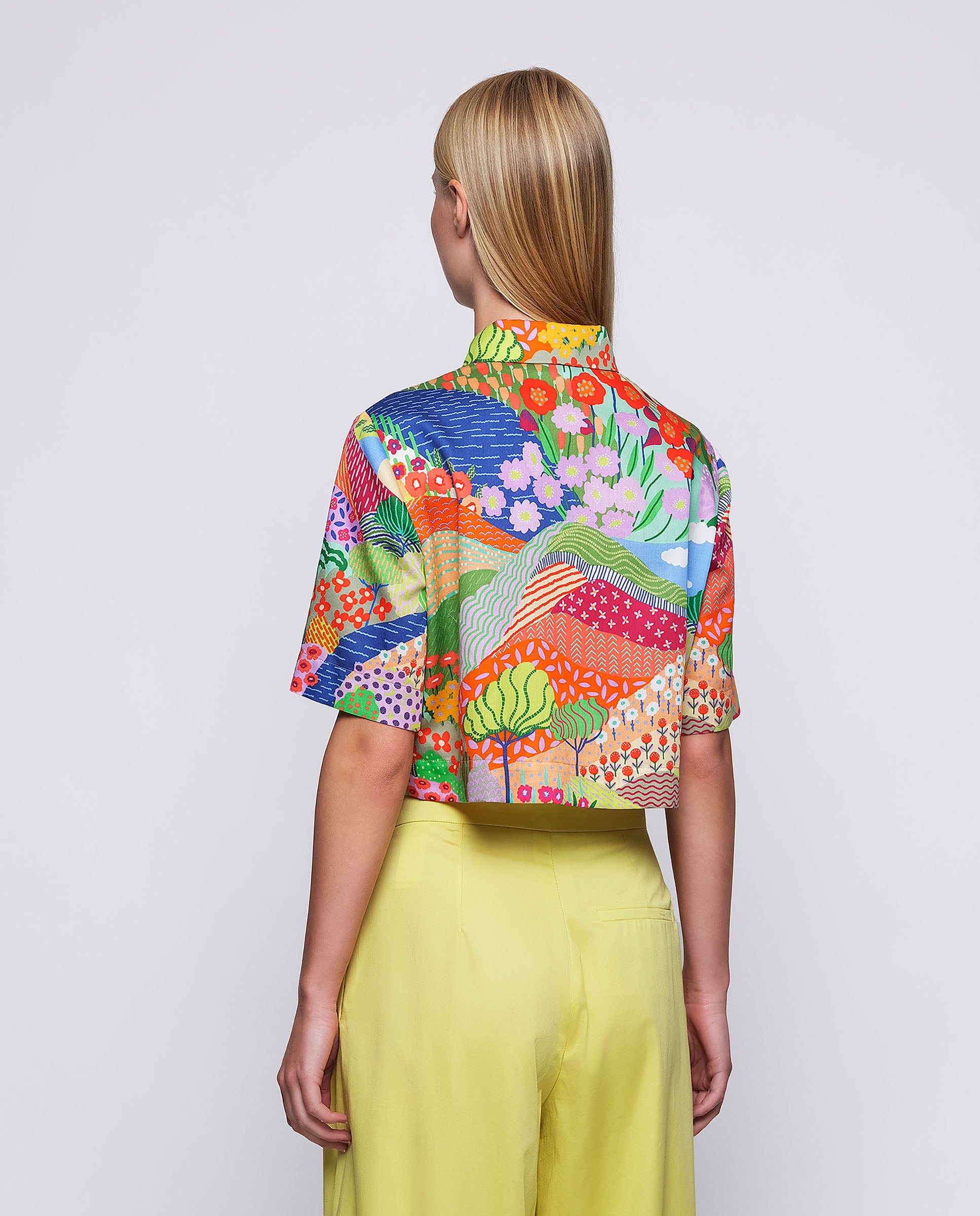Camisa corta estampado paisaje multicolor de algodón 100%. Cuello camisero, cierre central con botones, manga corta y pliegues en bajo. Fit semi-entallado.