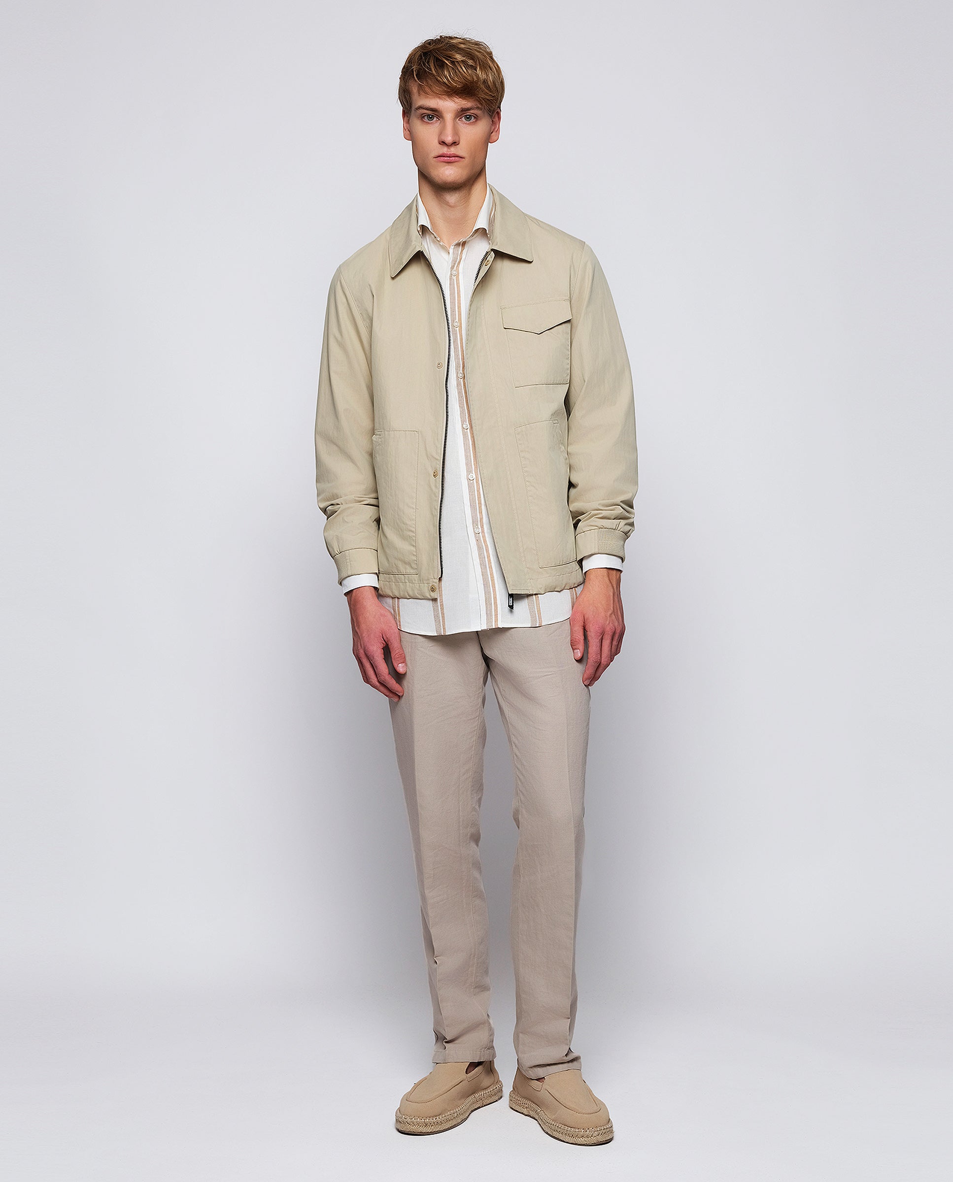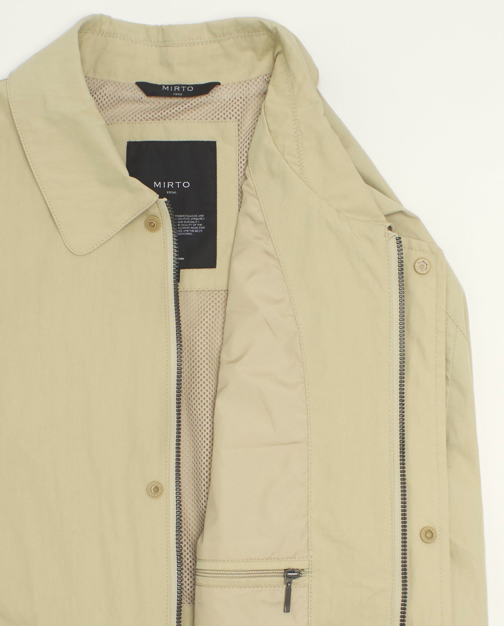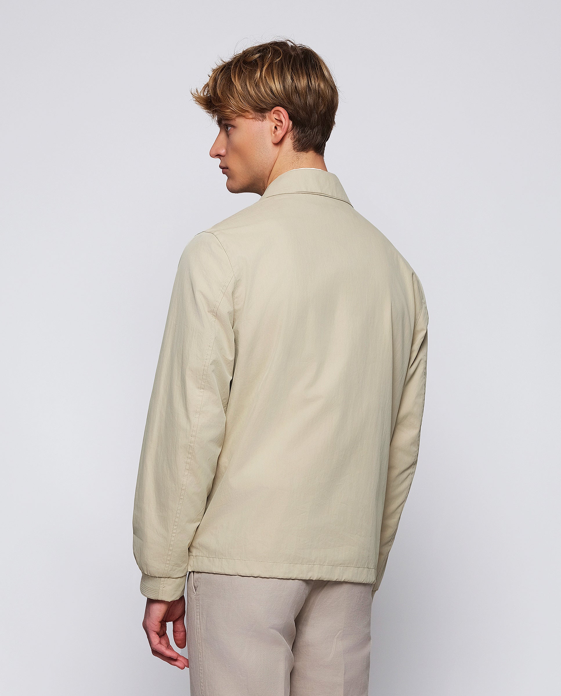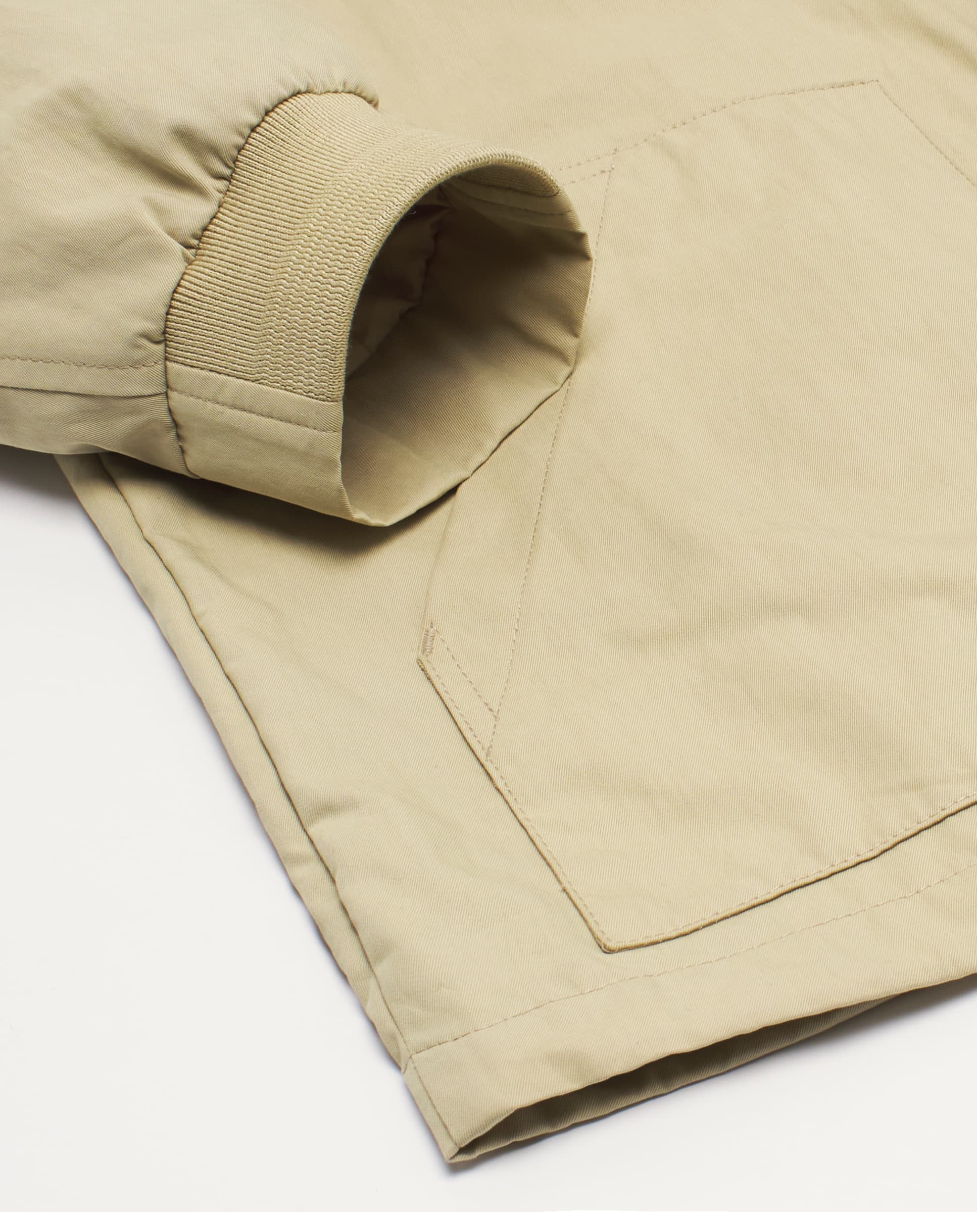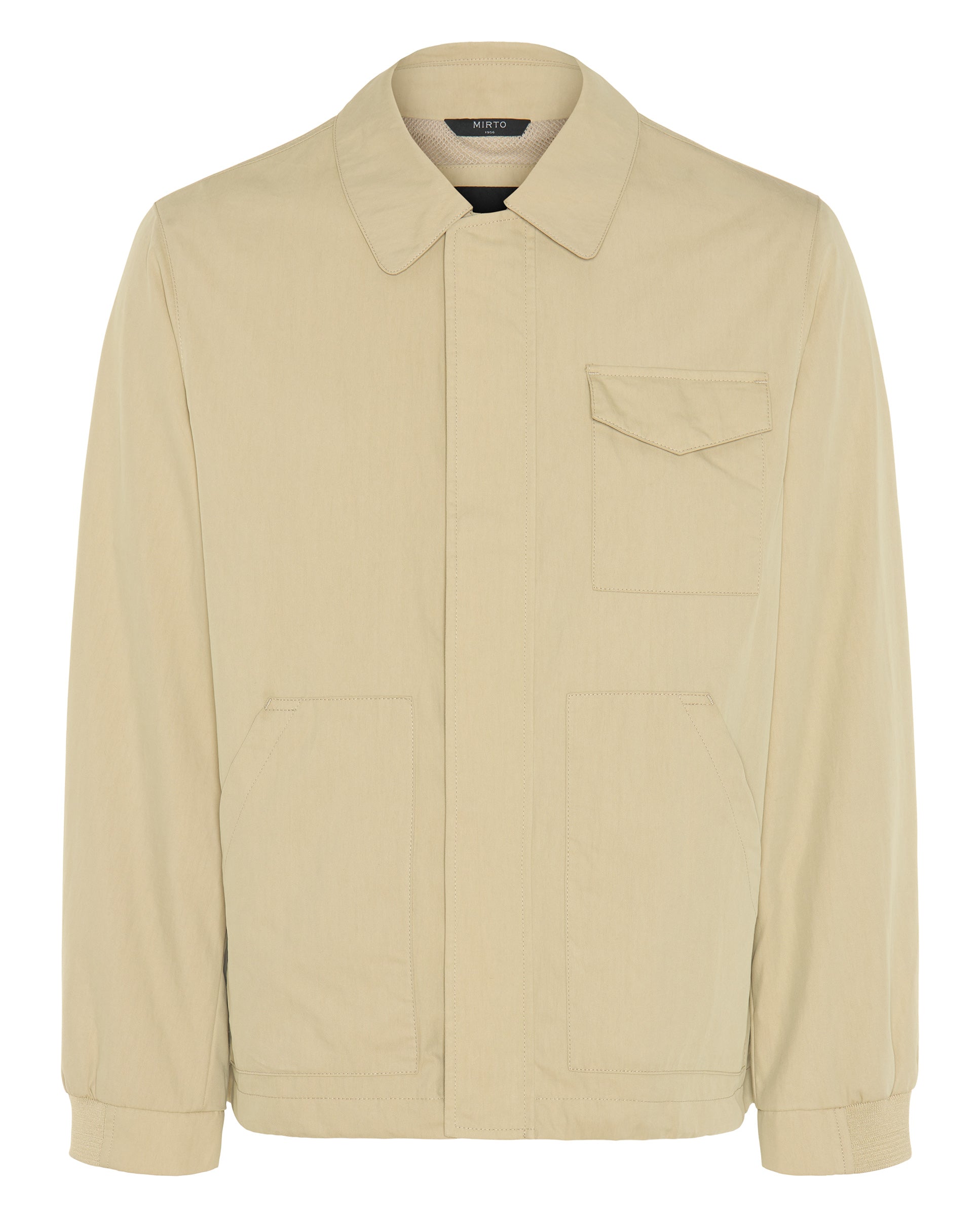 Chaqueta Trucker arena en algodón resistente al agua. Cierre central con cremallera bidireccional y tapeta, bolsillo con tapeta en pecho, bolsillos parche, ajustadores en cadera y puños elásticos.