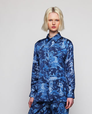 Pantalón en algodón elástico estampado toile de jouy diseñado en exclusiva por MIRTO, en colaboración con la acuarelista botánica Sena Cifuentes. Tiro alto, cierre con cremallera y botón. Bolsillos laterales y dos de parche en parte trasera. Pernera ancha.