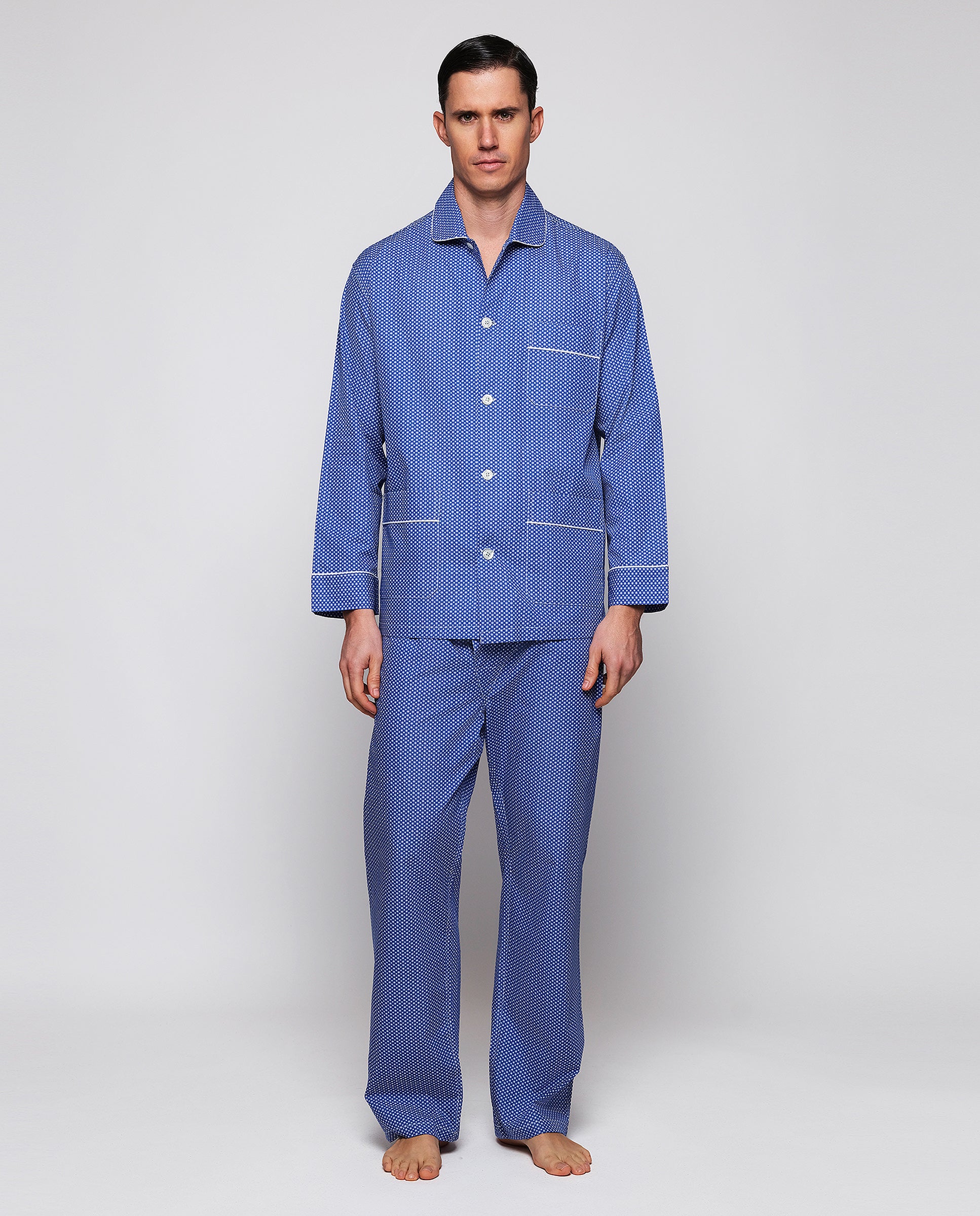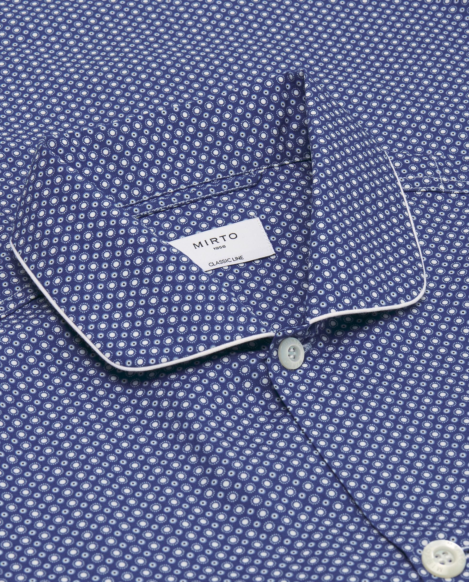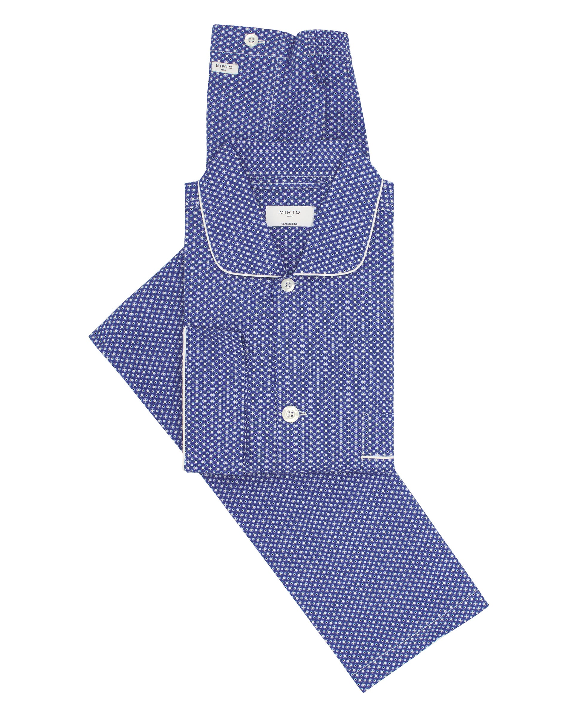 Pijama largo estampado motivo geométrico 100% algodón. Chaqueta abierta con botones, manga larga, tres bolsillos, cuello camisero y vivos blancos. Pantalón largo a juego, de corte recto, sin bolsillo, con cintura elástica y cierre con botones.